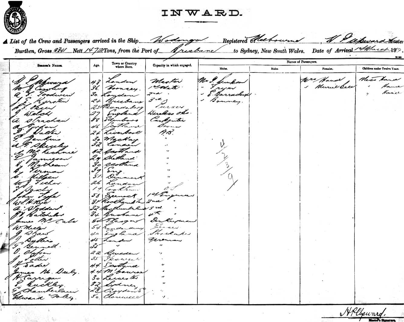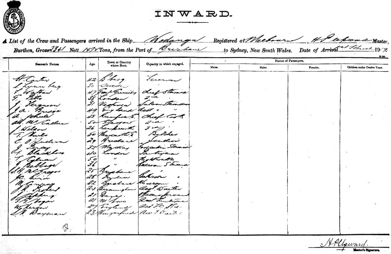 Mariners and ships in Australian Waters | WODONGAOF MELBOURNE, H. P. UPWARD, MASTER, BURTHEN 2341/1472 TONS FROM THE PORT OF BRISBANE TO SYDNEY, NEW SOUTH WALES, 1ST MARCH 1920 |