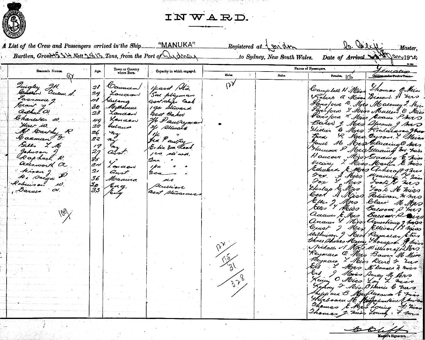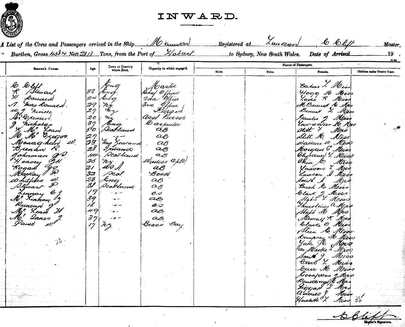 MANUKAOF LONDON, C. CLIFT, MASTER, BURTHEN 4584/2813 TONS FROM THE PORT OF HOBART TO SYDNEY, NEW SOUTH WALES, 1ST MARCH 1920 |