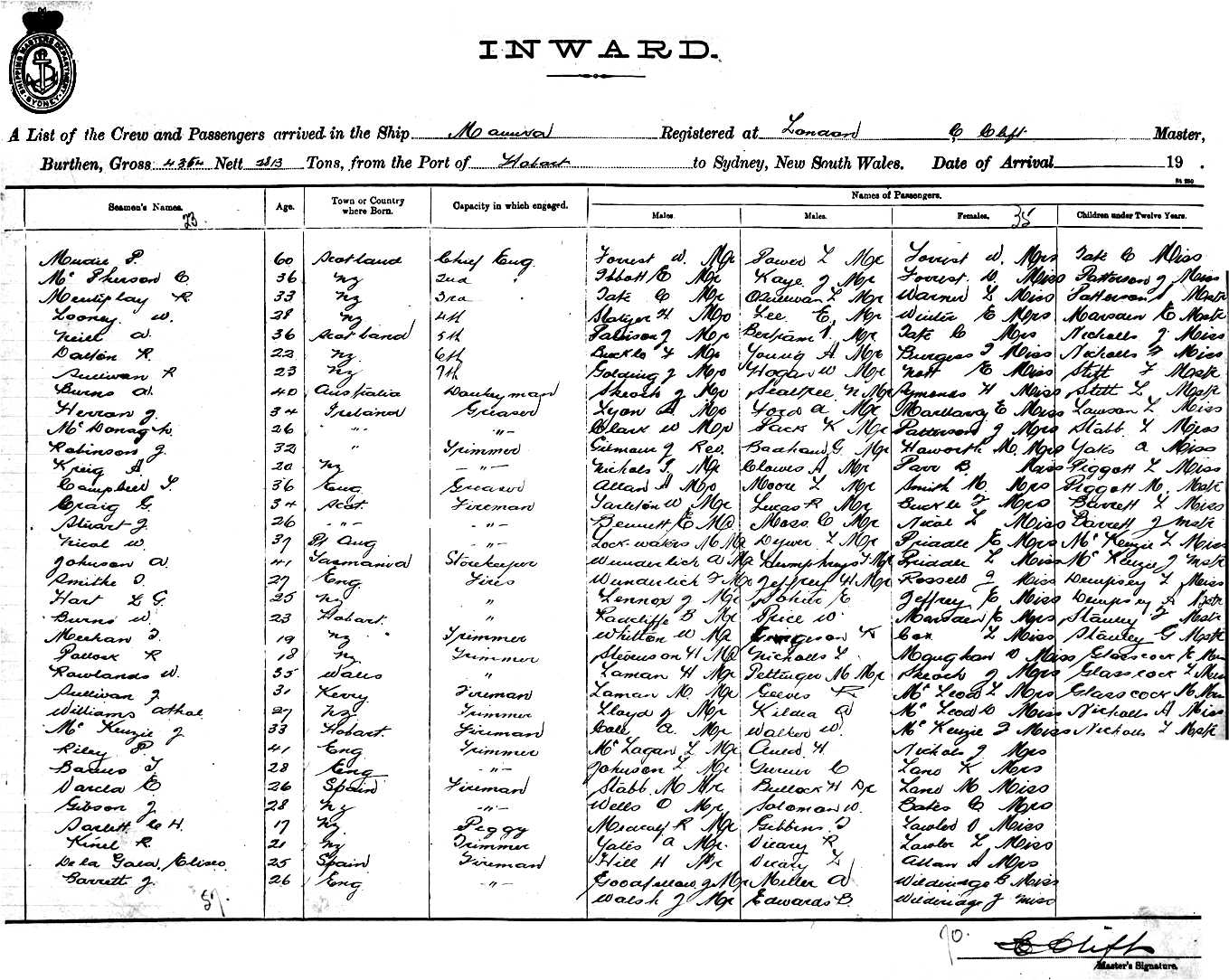 Source: State Records Authority of New South Wales: Shipping Master's Office; Passengers Arriving 1855 - 1922; NRS13278, [X443] reels 2109 & 2110. Transcribed by Lester Hamilton. Proofread by Lyn & Maurie. You may view/print a scan of the original list - a monitor set to high resolution is recommended for clarity. Use your back button to return. |