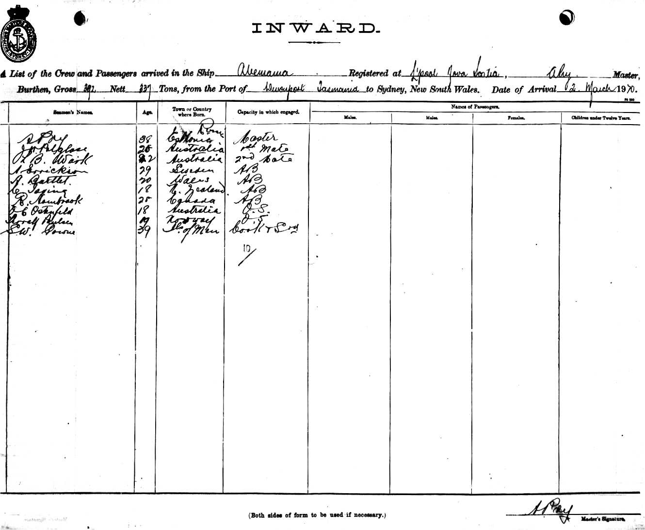 Mariners and ships in Australian Waters | ABEMAMAOF LIVERPOOL, NOVA SCOTIA, A. PRY, MASTER, BURTHEN 392/337 TONS FROM THE PORT OF DEVONPORT, TASMANIA TO SYDNEY, NEW SOUTH WALES, 2ND MARCH 1920 |