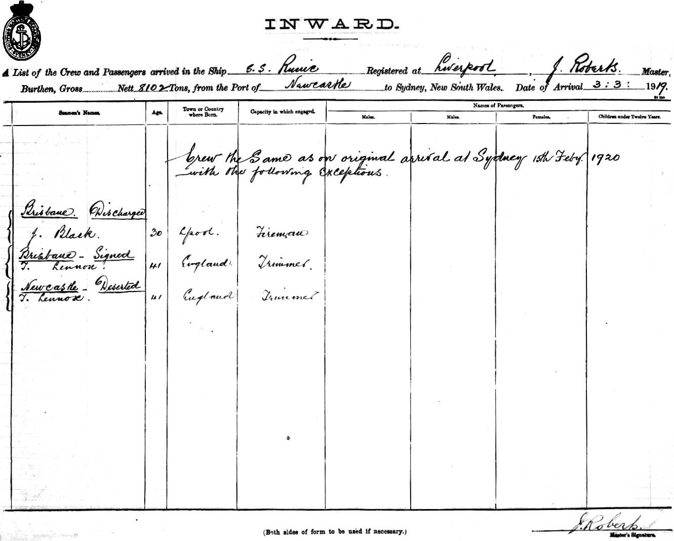 CREW THE SAME AS ARRIVAL SYDNEY 15TH FEBRUARY 1920 WITH THE FOLLOWING EXCEPTIONS:-- |