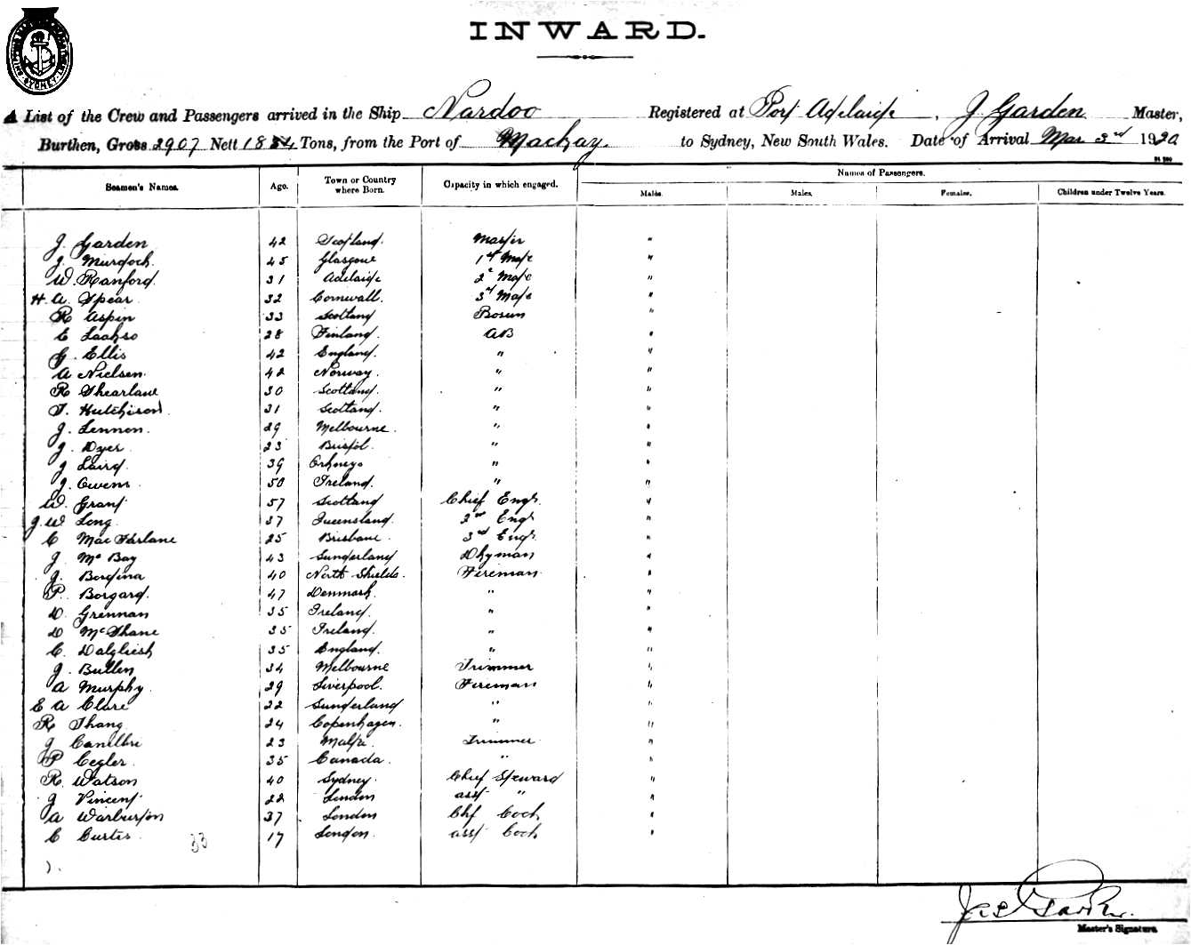 NARDOOOF PORT ADELAIDE, J. GARDEN, MASTER, BURTHEN 2907/1834 TONS FROM THE PORT OF MACKAY TO SYDNEY, NEW SOUTH WALES, 3RD MARCH 1920 |