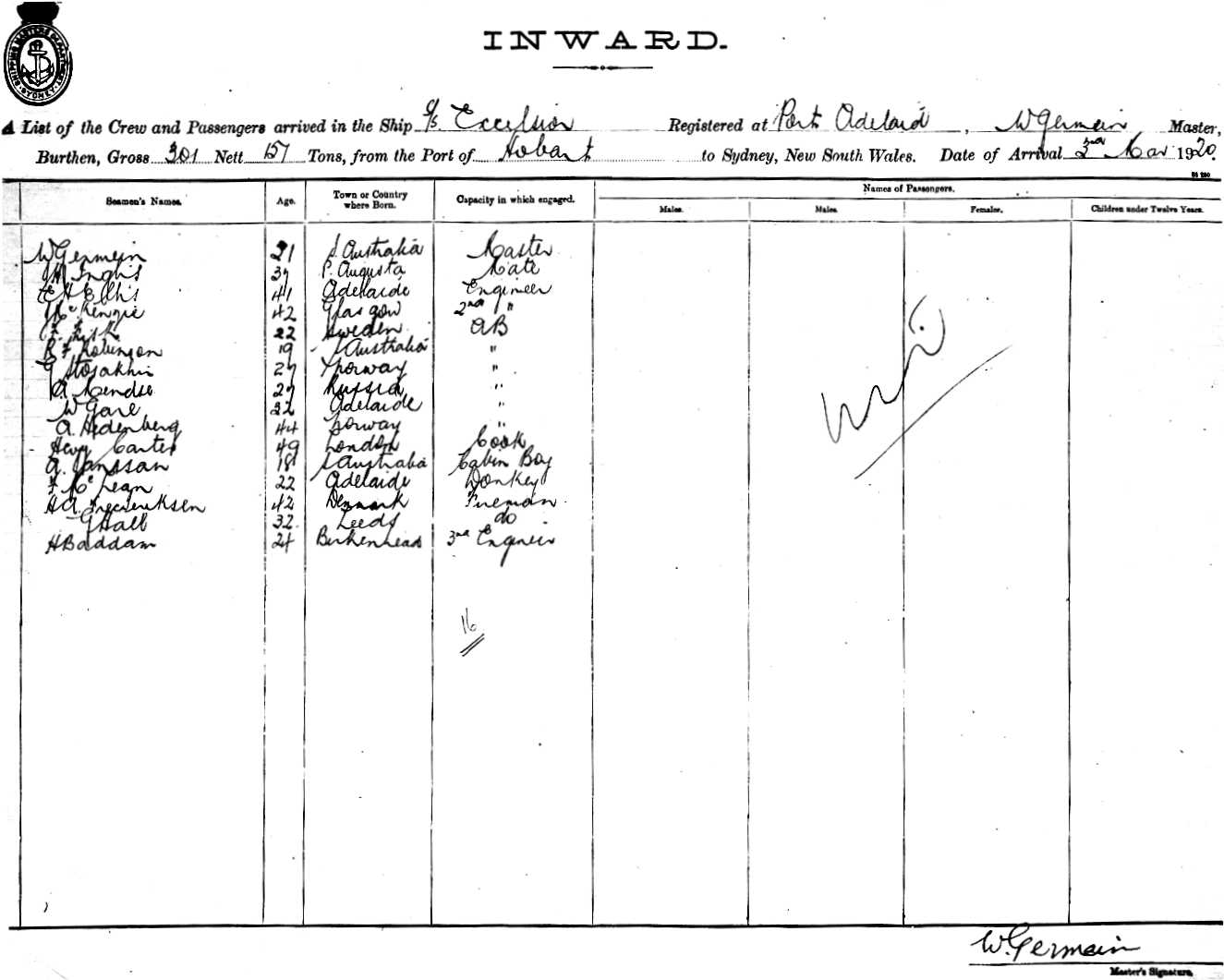 EXCELSIOROF PORT ADELAIDE, W. GERMEIN, MASTER, BURTHEN 301/157 TONS FROM THE PORT OF HOBART TO SYDNEY, NEW SOUTH WALES, 3RD MARCH 1920 |