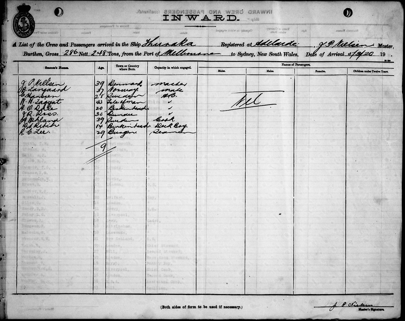 THURAKAOF ADELAIDE, J. P. NIELSEN, MASTER, BURTHEN 286/248 TONS FROM THE PORT OF MELBOURNE TO SYDNEY, NEW SOUTH WALES, 5TH MARCH 1920 |
