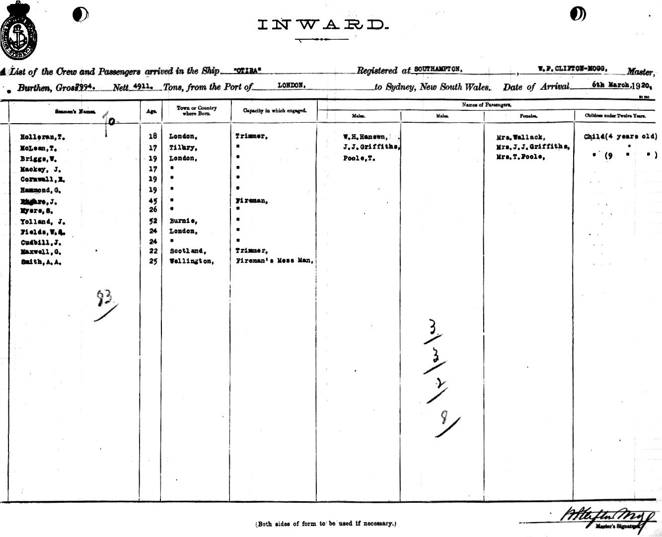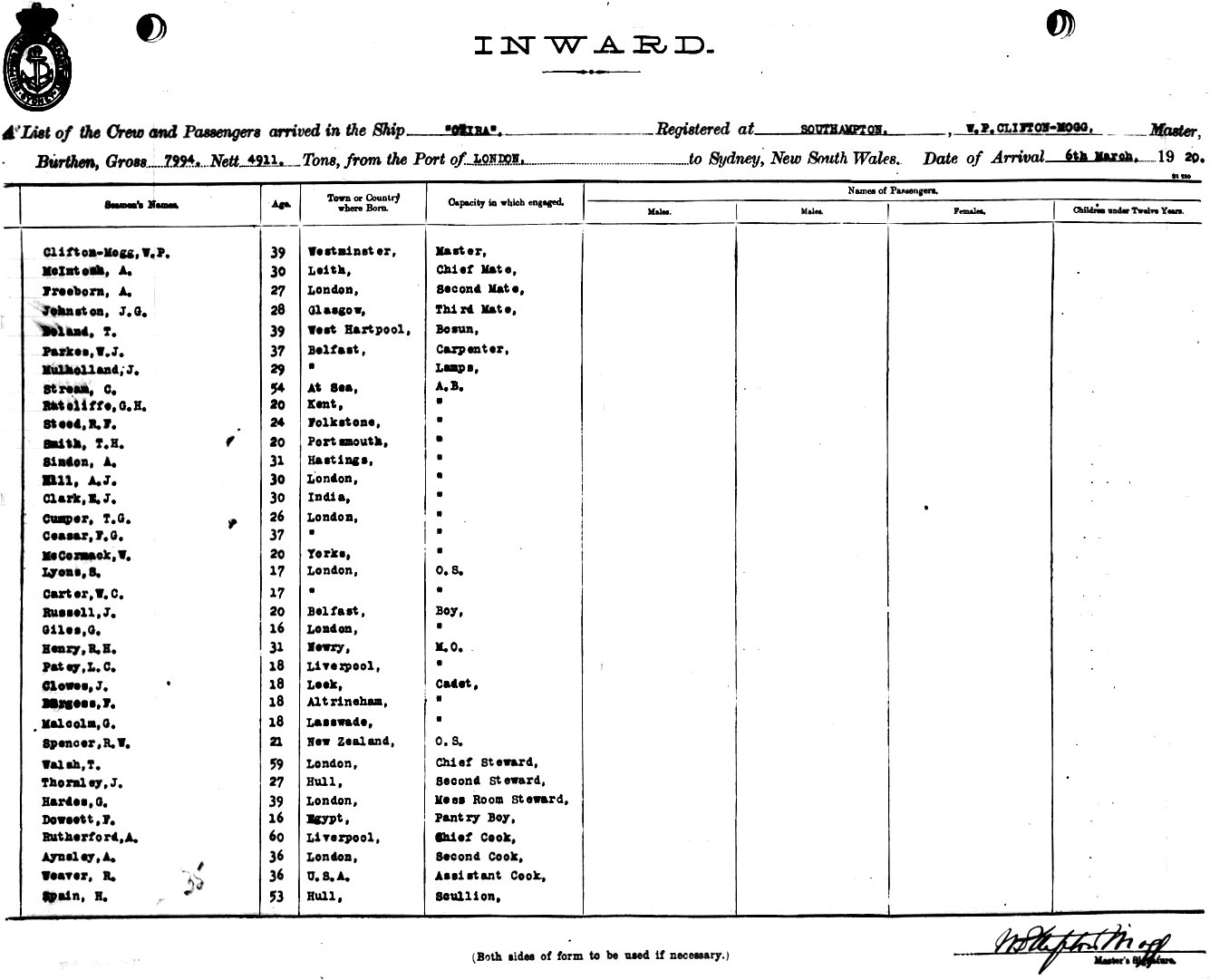 OTIRAOF SOUTHAMPTON, W. P. CLIFTON-MOGG, MASTER, BURTHEN 7994/4911 TONS FROM THE PORT OF LONDON TO SYDNEY, NEW SOUTH WALES, 6TH MARCH 1920 |