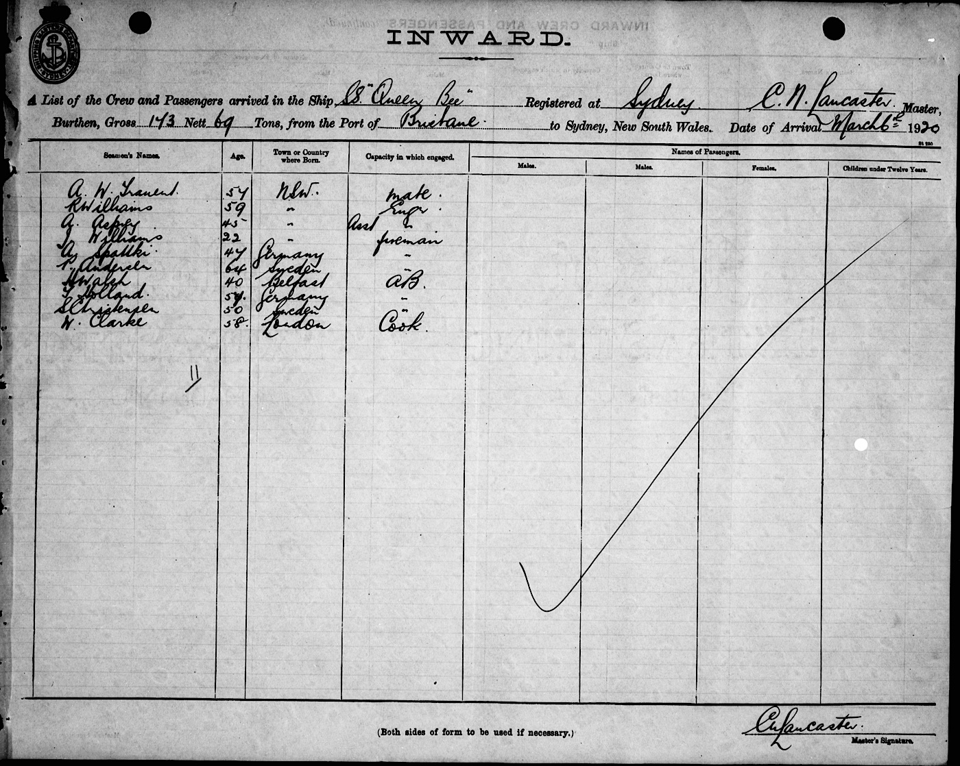 QUEEN BEEOF SYDNEY, C. N. LANCASTER, MASTER, BURTHEN 173/69 TONS FROM THE PORT OF BRISBANE TO SYDNEY, NEW SOUTH WALES, 6TH MARCH 1920 |