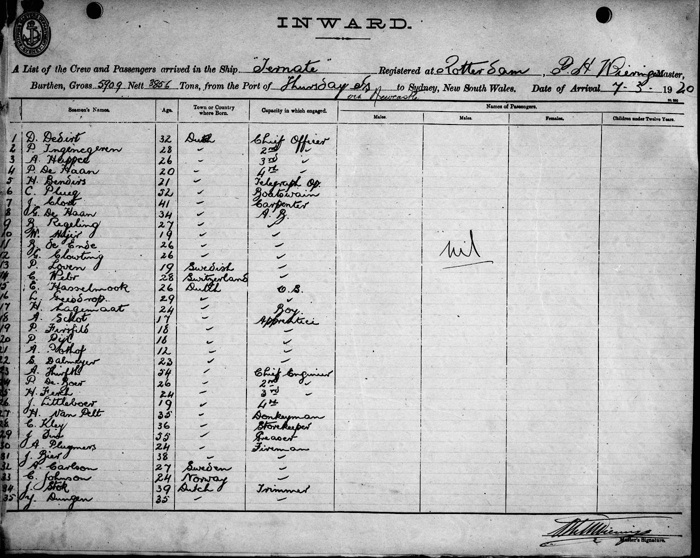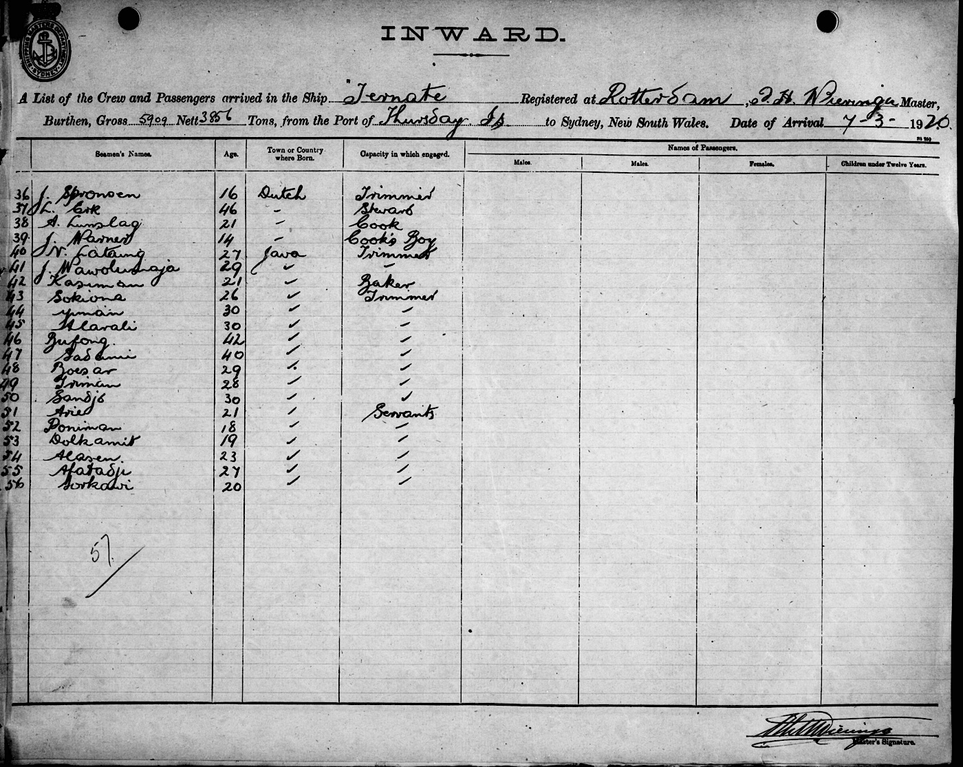 TERNATEOF ROTTERDAM, P. H. WIERINGA, MASTER, BURTHEN 5909/3856 TONS FROM THE PORT OF THURSDAY IS. VIA NEWCASTLE TO SYDNEY, NEW SOUTH WALES, 7TH MARCH 1920 |