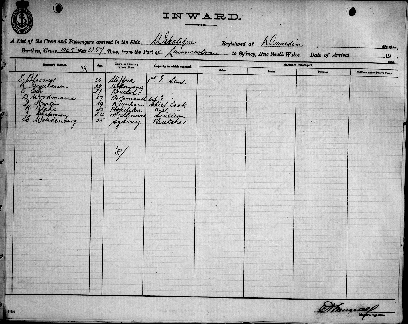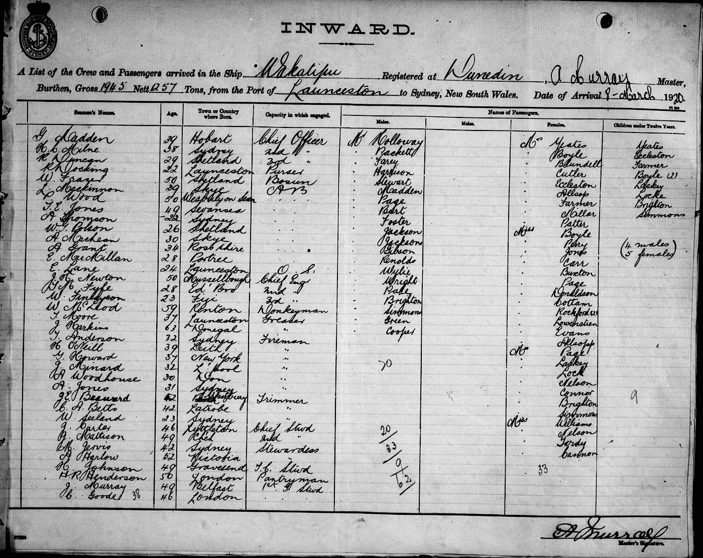WAKATIPUOF DUNEDIN, A. MURRAY, MASTER, BURTHEN 1945/1257 TONS FROM THE PORT OF LAUNCESTON TO SYDNEY, NEW SOUTH WALES, 8TH MARCH 1920 |