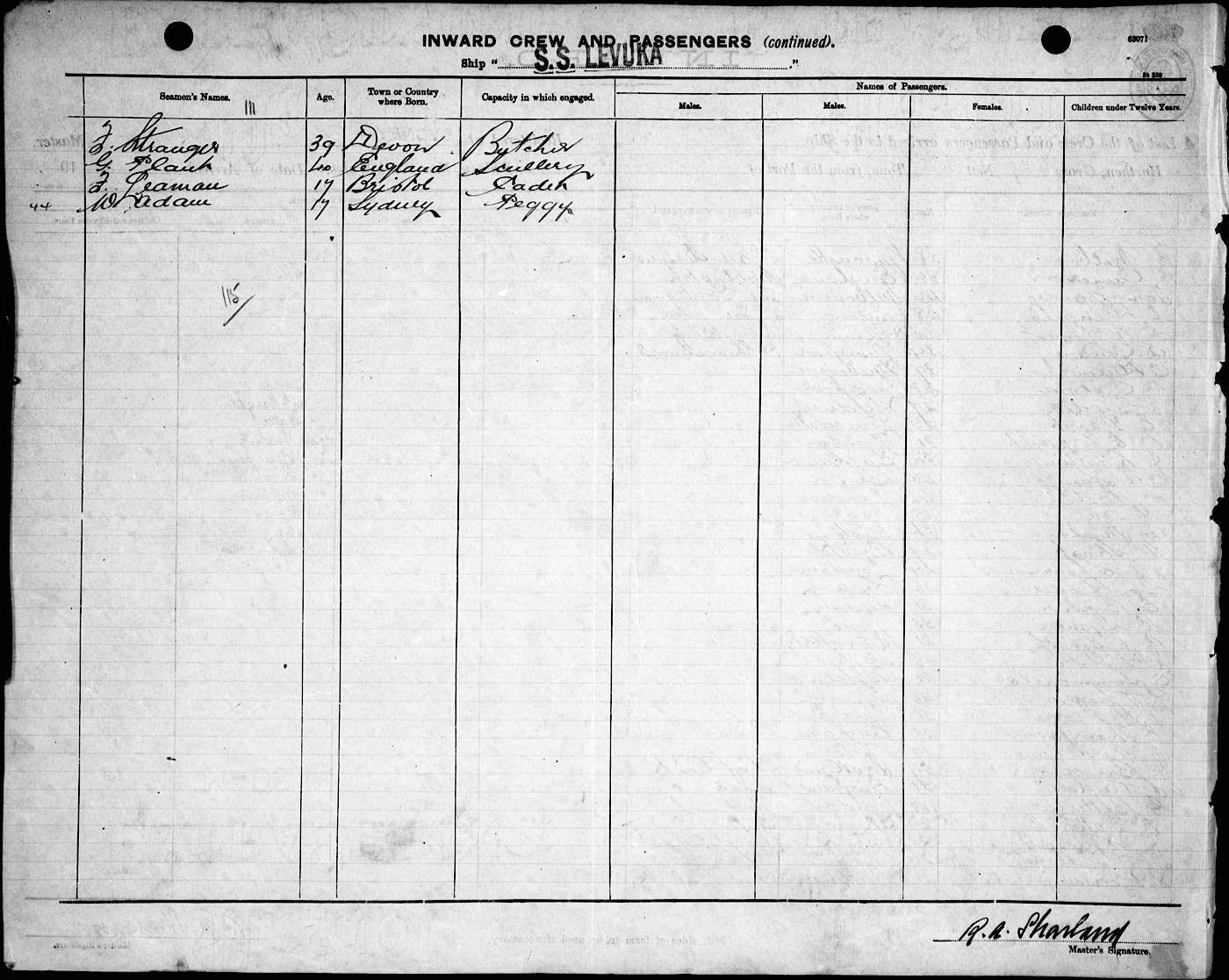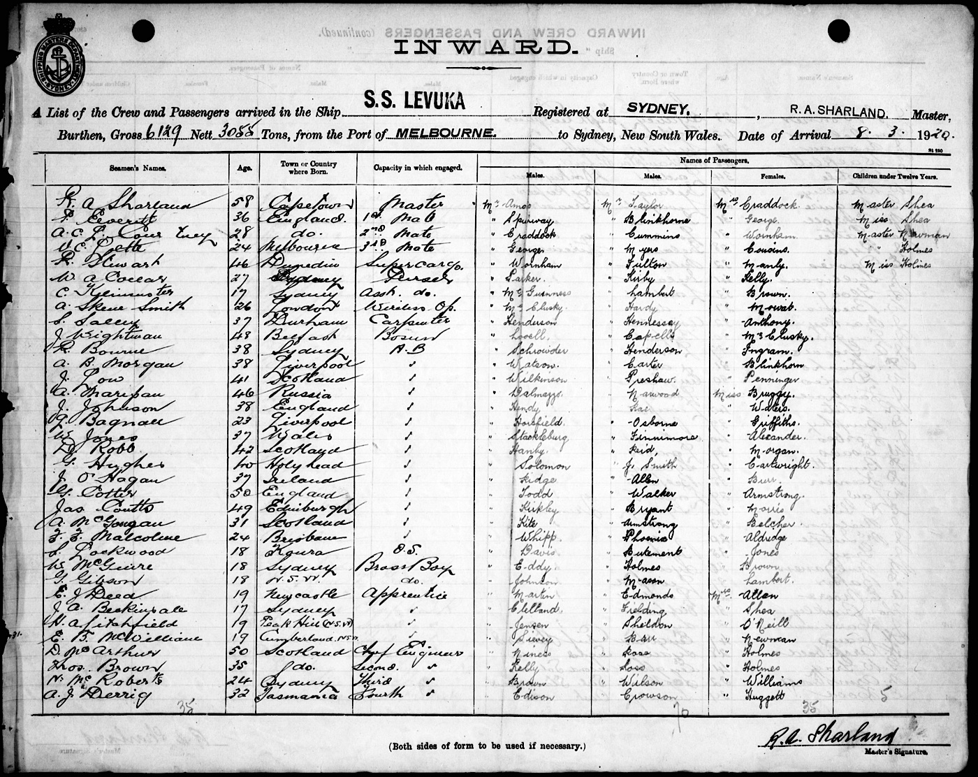 Mariners and ships in Australian Waters | LEVUKAOF SYDNEY, R. A. SHARLAND, MASTER, BURTHEN 6129/3055 TONS FROM THE PORT OF MELBOURNE TO SYDNEY, NEW SOUTH WALES, 8TH MARCH 1920 |