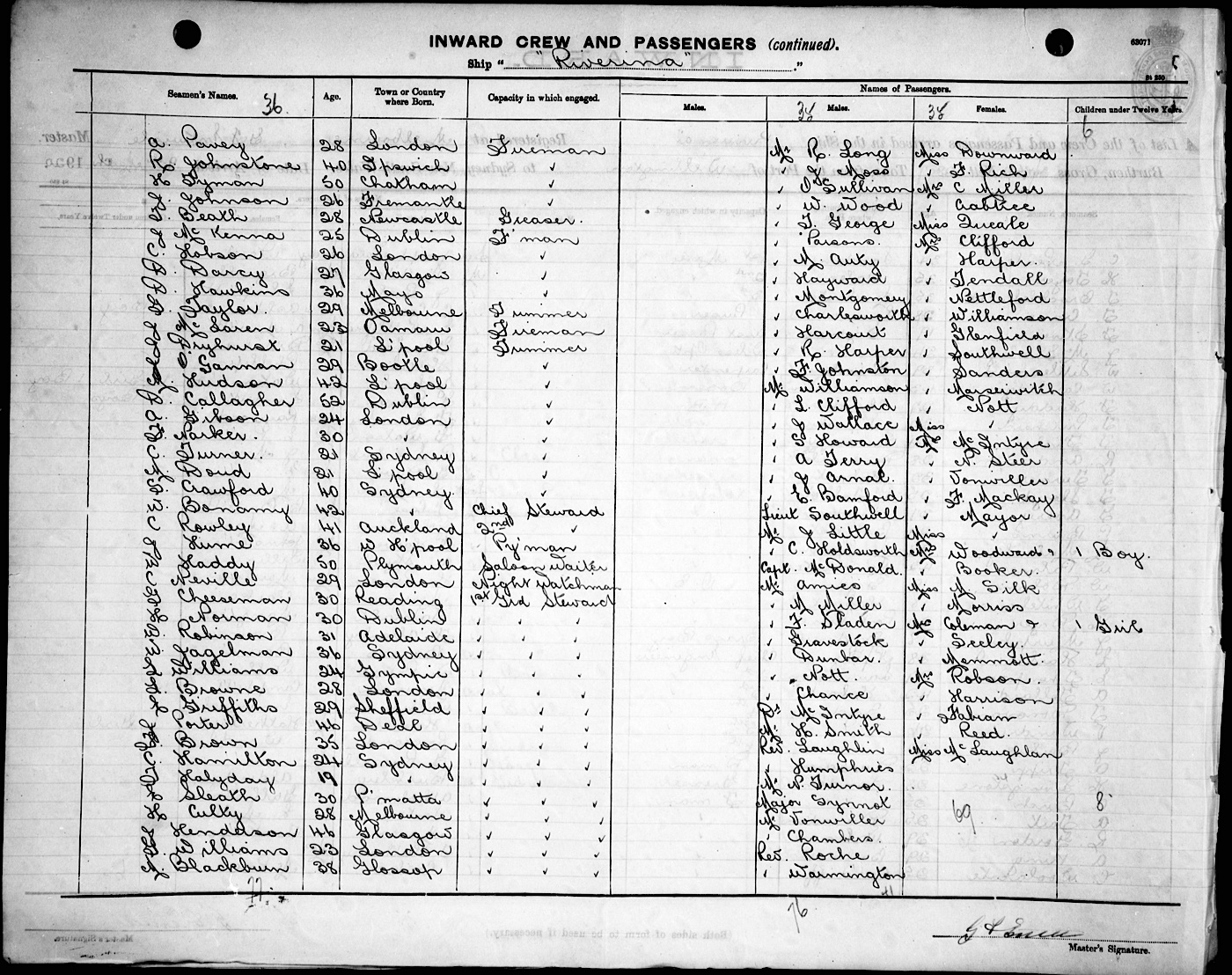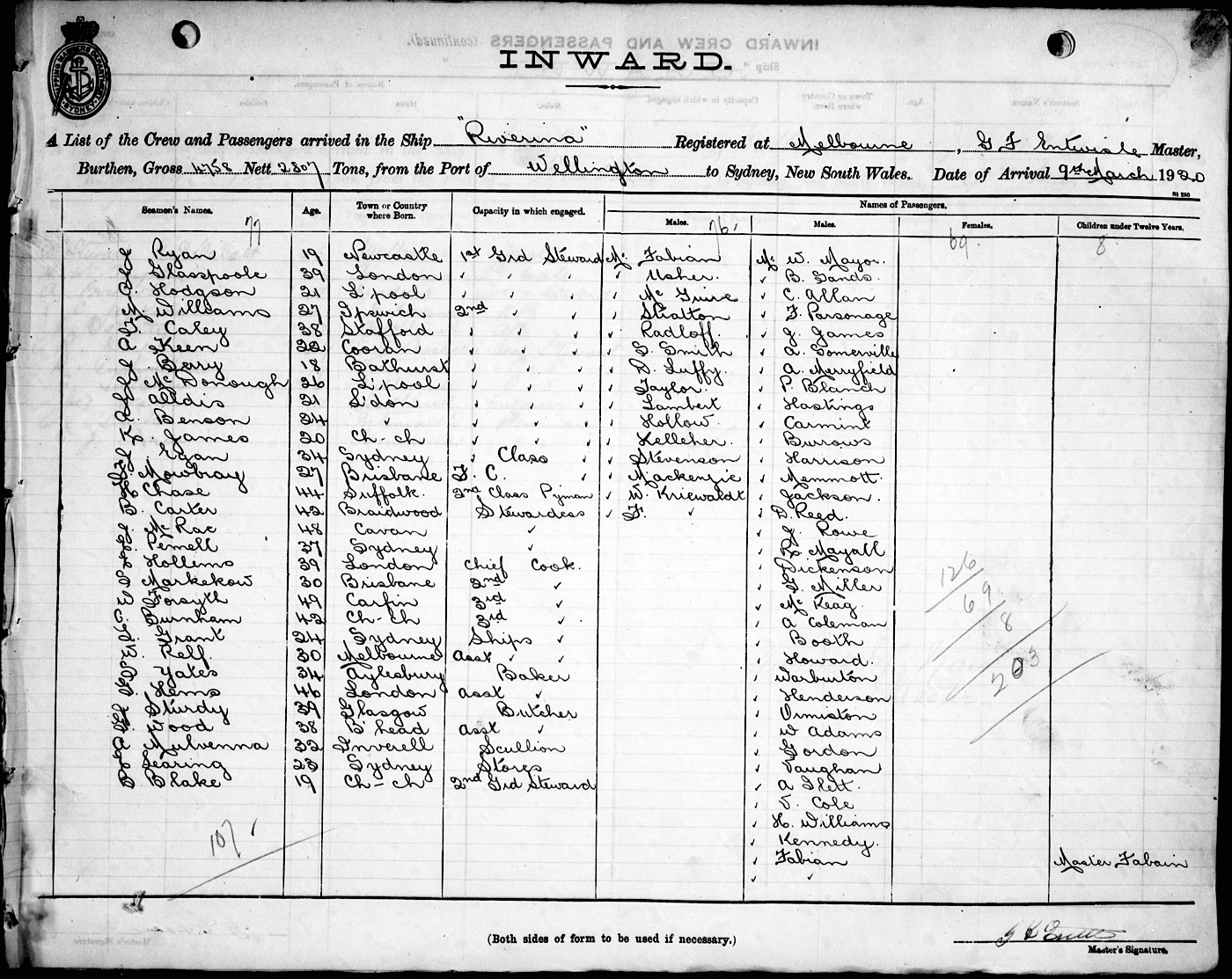RIVERINAOF MELBOURNE, G. F. ENTWISLE, MASTER, BURTHEN 4758/2807 TONS FROM THE PORT OF WELLINGTON TO SYDNEY, NEW SOUTH WALES, 9TH MARCH 1920 |