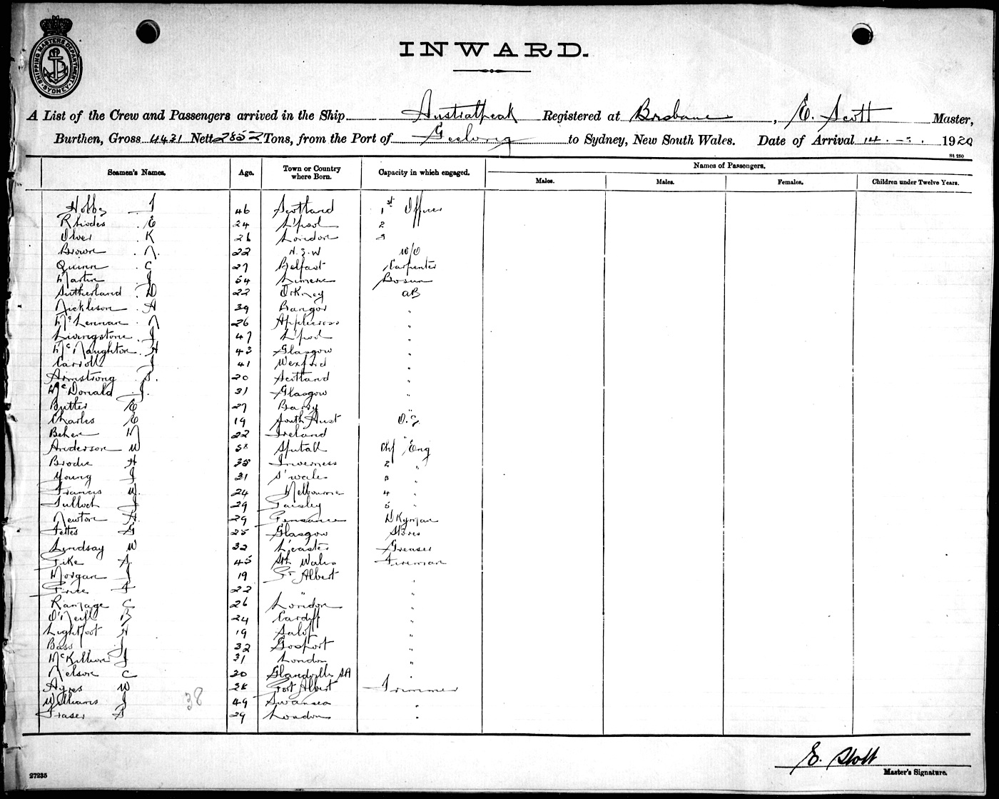AUSTRALPEAKOF BRISBANE, E. SCOTT, MASTER, BURTHEN 4431/2852 TONS FROM THE PORT OF GEELONG TO SYDNEY, NEW SOUTH WALES, 14TH MARCH 1920 |