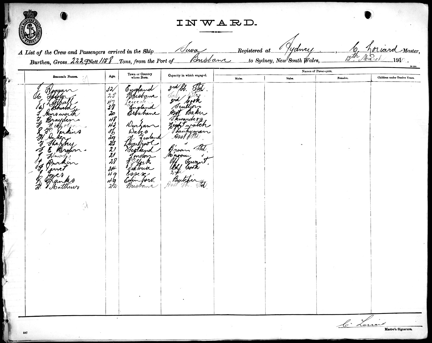SUVAOF SYDNEY, C. LORIARD, MASTER, BURTHEN 2229/1158 TONS FROM THE PORT OF BRISBANE TO SYDNEY, NEW SOUTH WALES, 15TH MARCH 1920 |