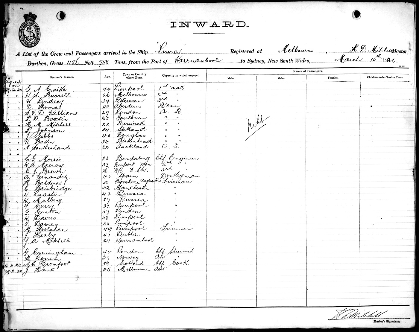 Mariners and ships in Australian Waters | LEURAOF MELBOURNE, H. D. MITCHELL, MASTER, BURTHEN 1186/758 TONS FROM THE PORT OF WARRNAMBOOL TO SYDNEY, NEW SOUTH WALES, 15TH MARCH 1920 |