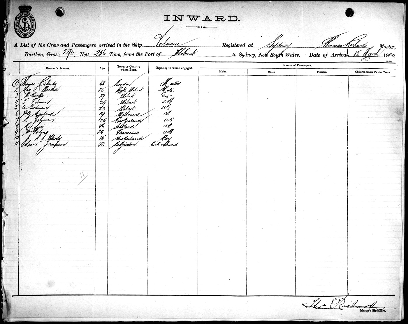 VALMARIEOF SYDNEY, THOMAS RICHARDS, MASTER, BURTHEN 290/256 TONS FROM THE PORT OF HOBART TO SYDNEY, NEW SOUTH WALES, 15TH MARCH 1920 |