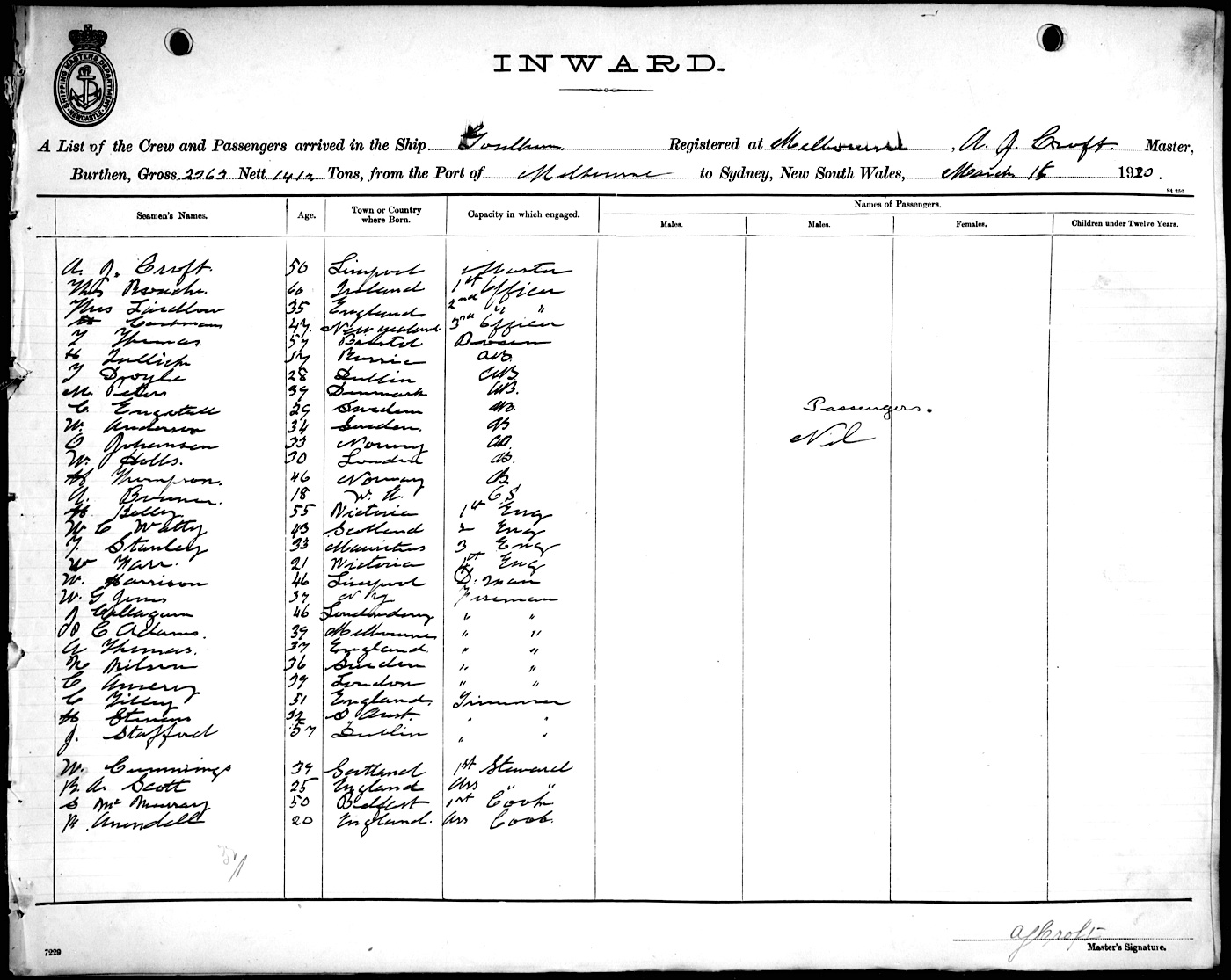 GOULBURNOF MELBOURNE, A. J. CROFT, MASTER, BURTHEN 2263/1412 TONS FROM THE PORT OF MELBOURNE TO SYDNEY, NEW SOUTH WALES, 15TH MARCH 1920 |