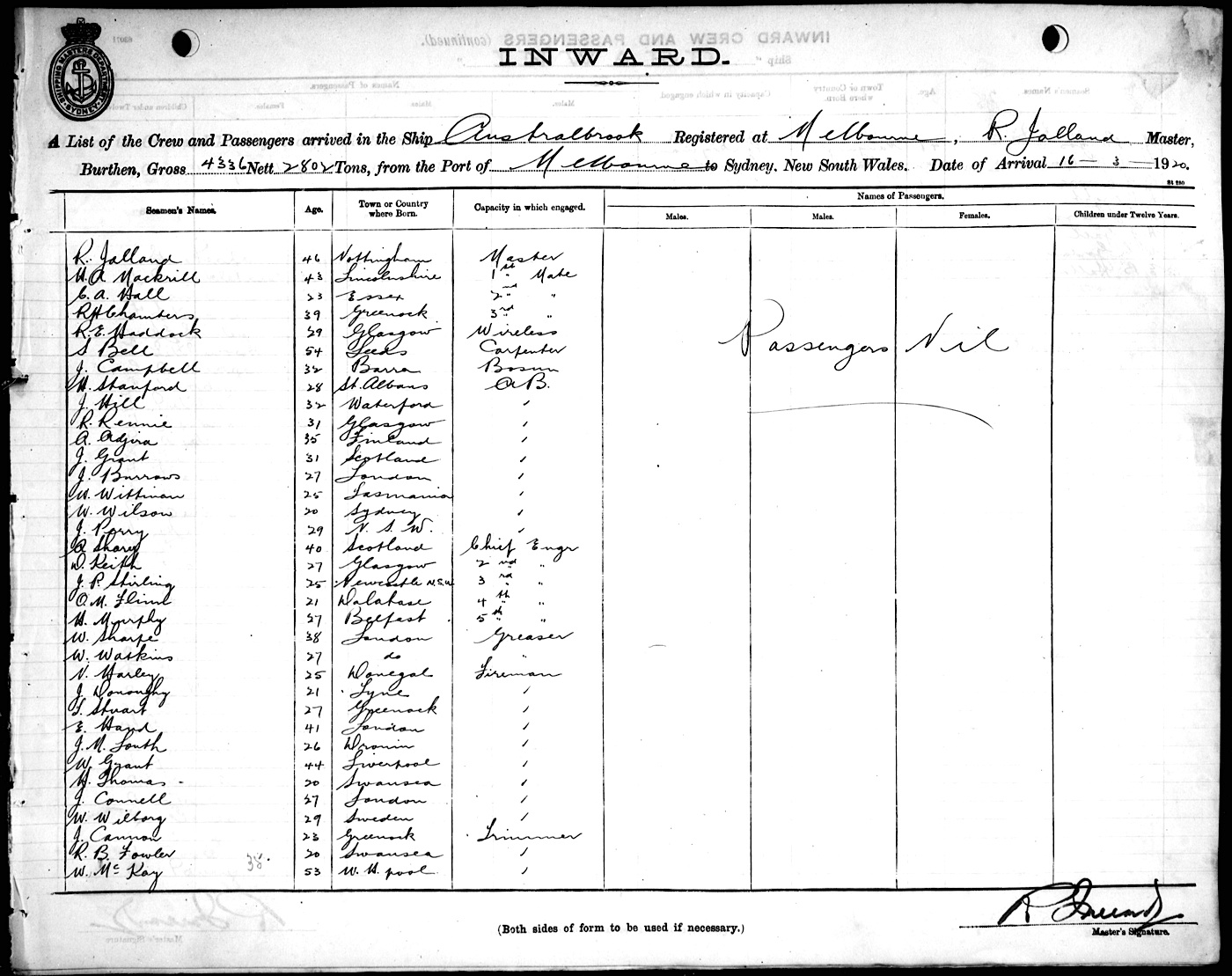 Mariners and ships in Australian Waters | AUSTRALBROOKOF MELBOURNE, R. JALLAND, MASTER, BURTHEN 4336/2802 TONS FROM THE PORT OF MELBOURNE TO SYDNEY, NEW SOUTH WALES, 16TH MARCH 1920 |