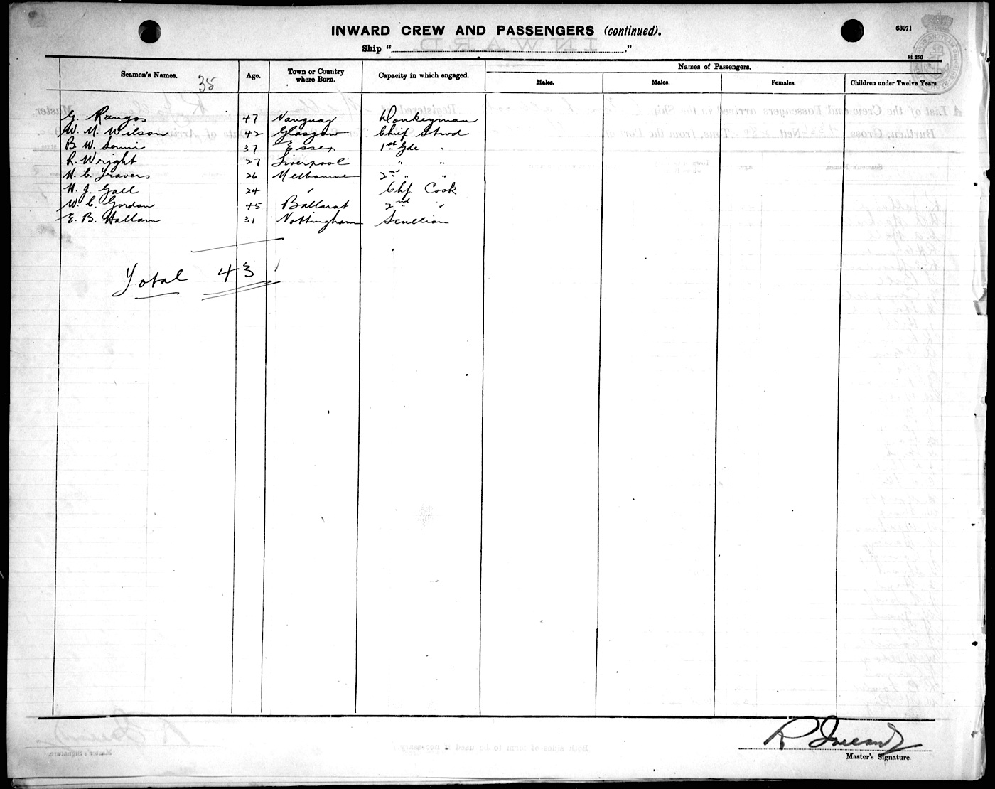 Modifications made to scans: In some instances, text was enhanced - there was still an occasional name or list which defied this effort to read it; the Master's signature is usually found at the bottom right corner of the page; some pages have been shortened; excessive black markings have been removed. The last two mods. were to enable the fastest possible display in your browser. | Email Mary-Anne Warner 2025 | Mariner's Home | This month's list | Search |