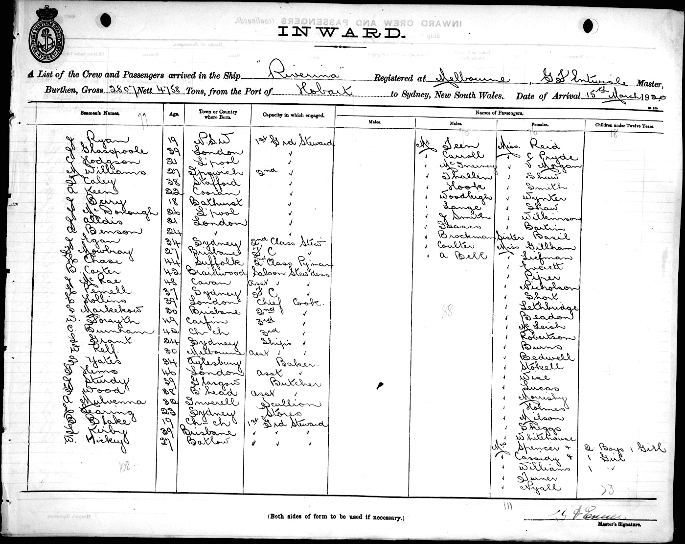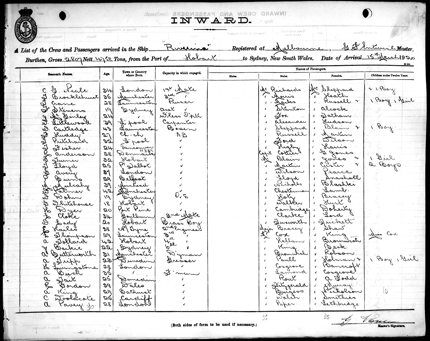 RIVERINAOF MELBOURNE, G. F. ENTWISLE, MASTER, BURTHEN 2807/4758 TONS FROM THE PORT OF HOBART TO SYDNEY, NEW SOUTH WALES, 15TH MARCH 1920 |