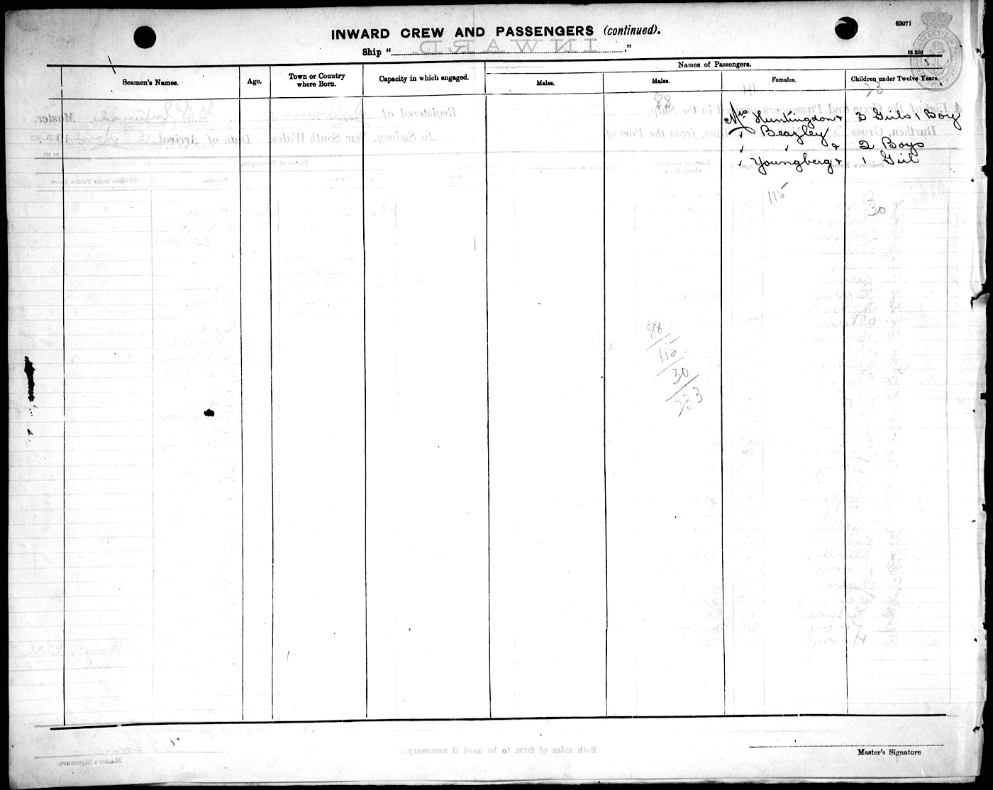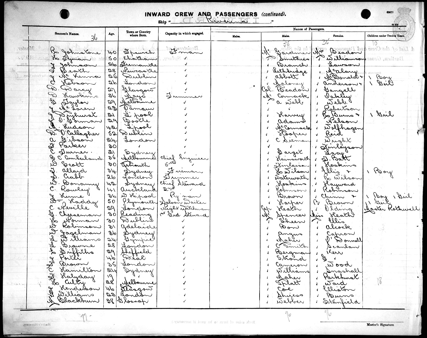Source: State Records Authority of New South Wales: Shipping Master's Office; Passengers Arriving 1855 - 1922; NRS13278, [X443] reels 2109 & 2110. Transcribed by Lester Hamilton. Proofread by Lyn & Maurie. You may view/print a scan of the original list - a monitor set to high resolution is recommended for clarity. Use your back button to return. |