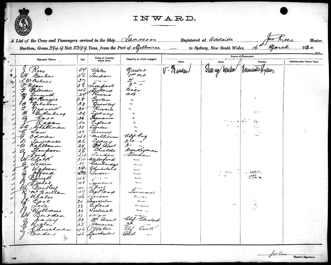 LAMMEROOOF ADELAIDE, JNO. REES, MASTER, BURTHEN 3949/2399 TONS FROM THE PORT OF MELBOURNE TO SYDNEY, NEW SOUTH WALES, 16TH MARCH 1920 |