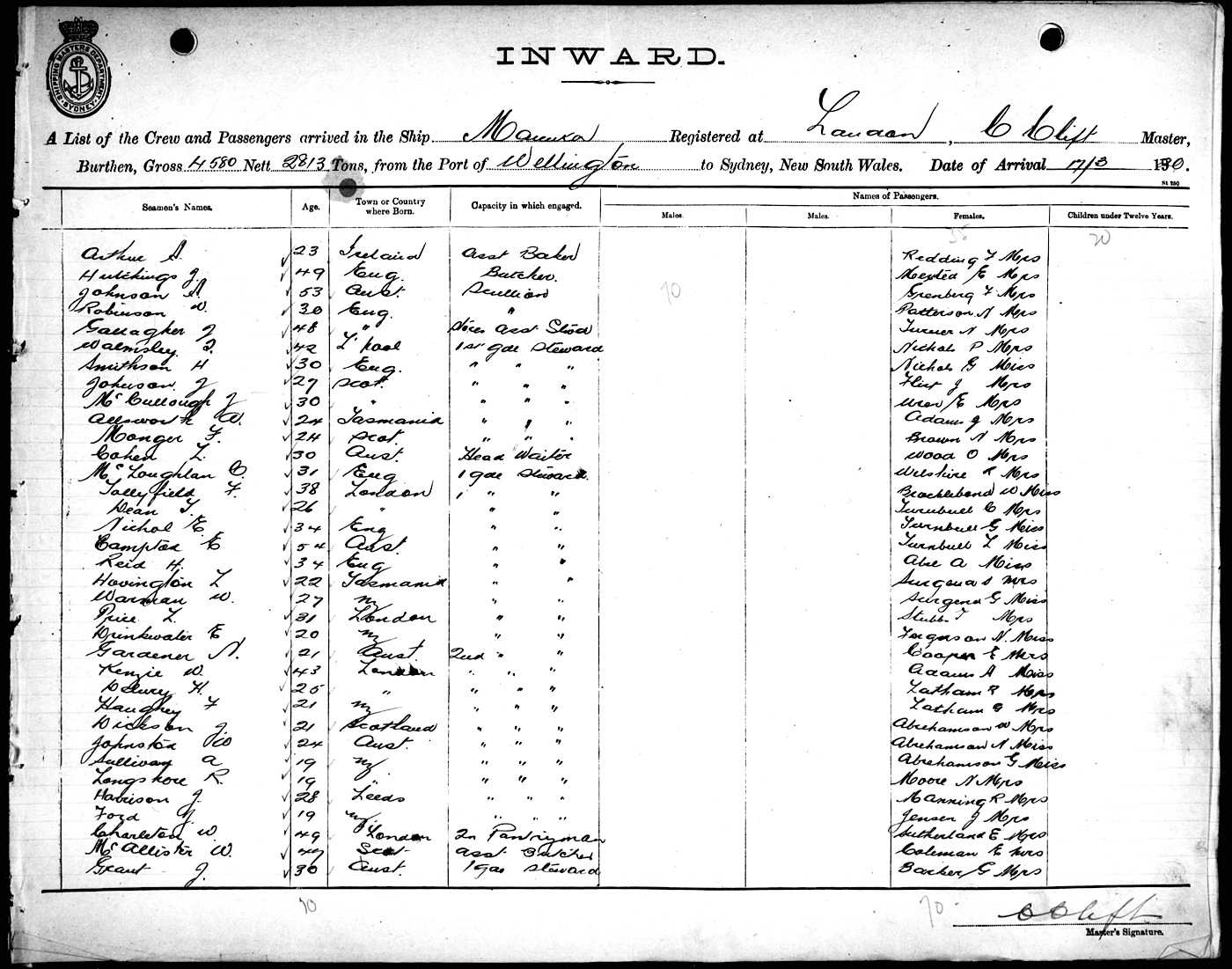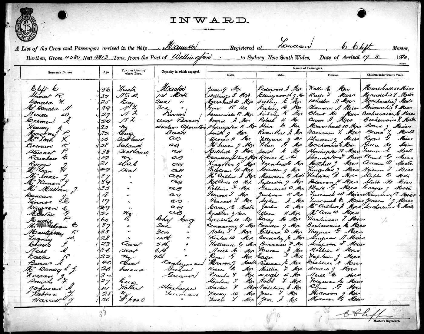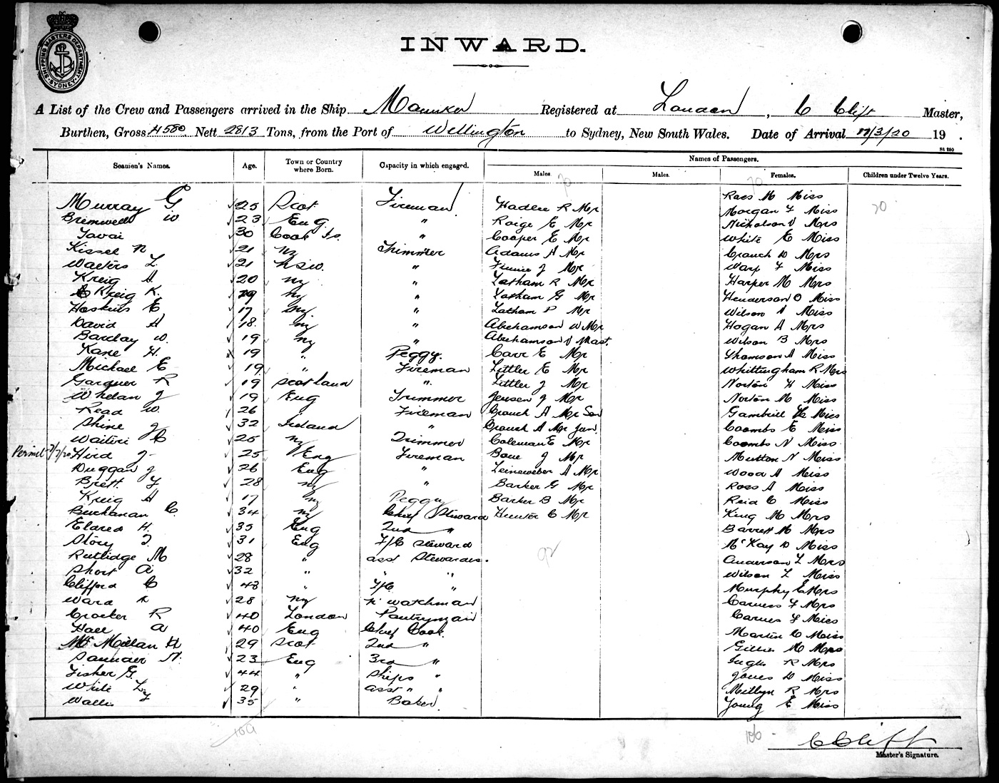 MANUKAOF LONDON, C. CLIFT, MASTER, BURTHEN 4580/2813 TONS FROM THE PORT OF WELLINGTON TO SYDNEY, NEW SOUTH WALES, 17TH MARCH 1920 |