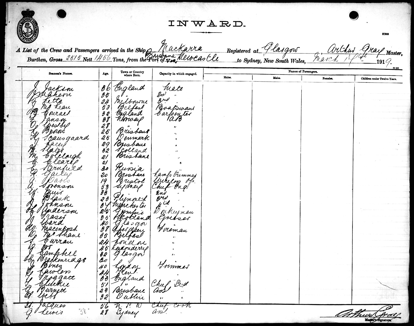 MACKARRAOF GLASGOW, ARTHUR GRAY, MASTER, BURTHEN 2515/1456 TONS FROM THE PORT OF BRISBANE VIA NEWCASTLE TO SYDNEY, NEW SOUTH WALES, 17TH MARCH 1920 |