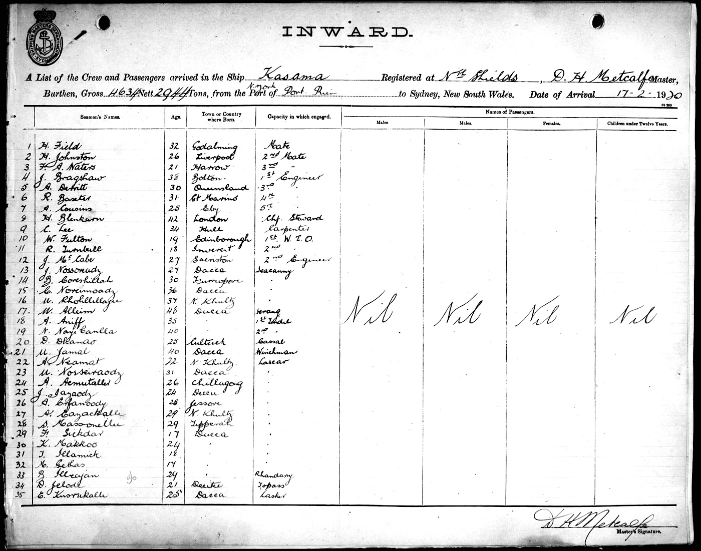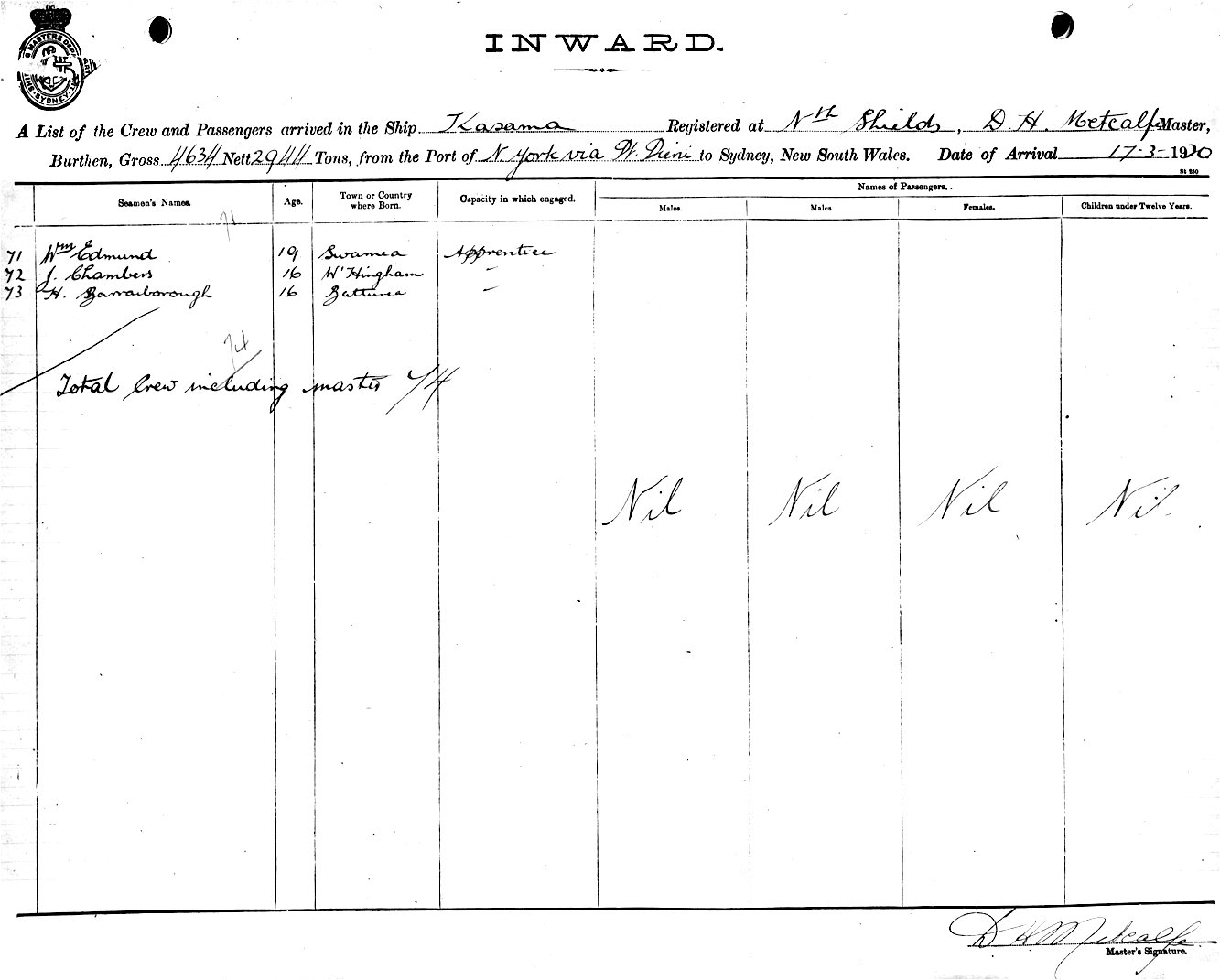 KASAMAOF N0RTH SHIELDS, D. H. METCALFE, MASTER, BURTHEN 4634/2944 TONS FROM THE PORT OF NEW YORK VIA PORT PIRIE TO SYDNEY, NEW SOUTH WALES, 17TH MARCH 1920 |