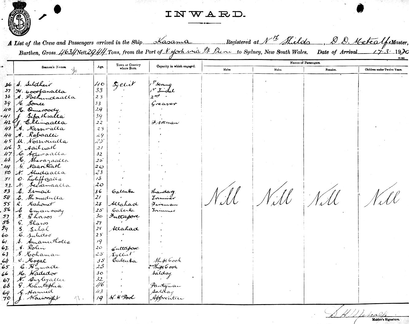 Source: State Records Authority of New South Wales: Shipping Master's Office; Passengers Arriving 1855 - 1922; NRS13278, [X443] reels 2109 & 2110. Transcribed by Lester Hamilton. Proofread by Lyn & Maurie. You may view/print a scan of the original list - a monitor set to high resolution is recommended for clarity. Use your back button to return. |