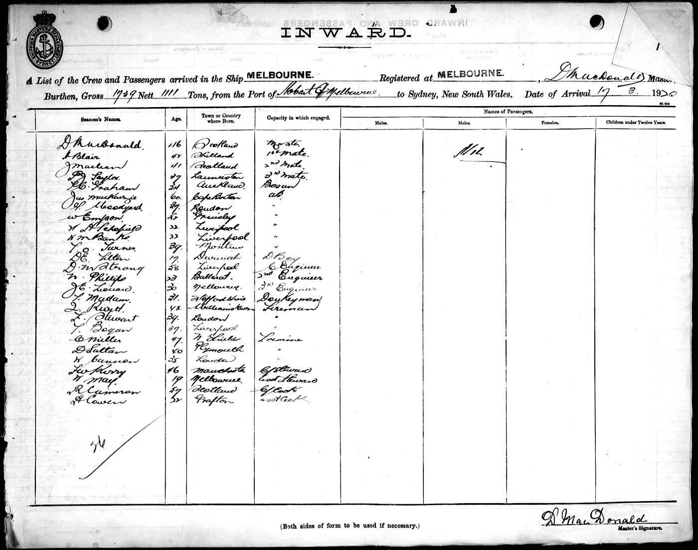 MELBOURNEOF MELBOURNE, D. MACDONALD, MASTER, BURTHEN 1739/1111 TONS FROM THE PORT OF HOBART & MELBOURNE TO SYDNEY, NEW SOUTH WALES, 17TH MARCH 1920 |