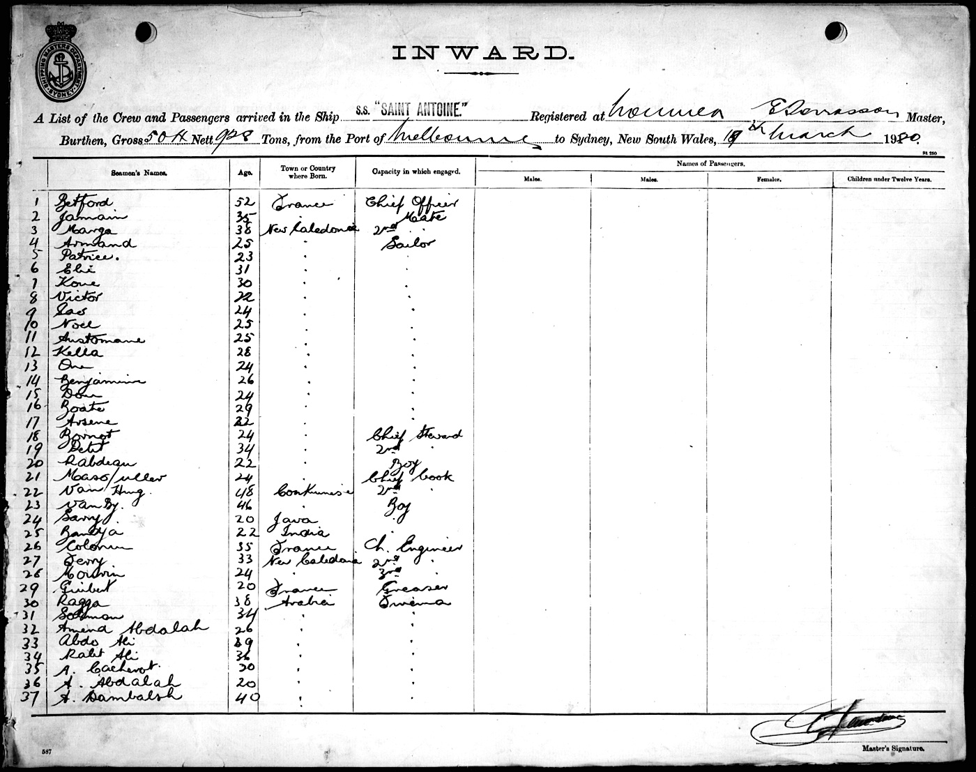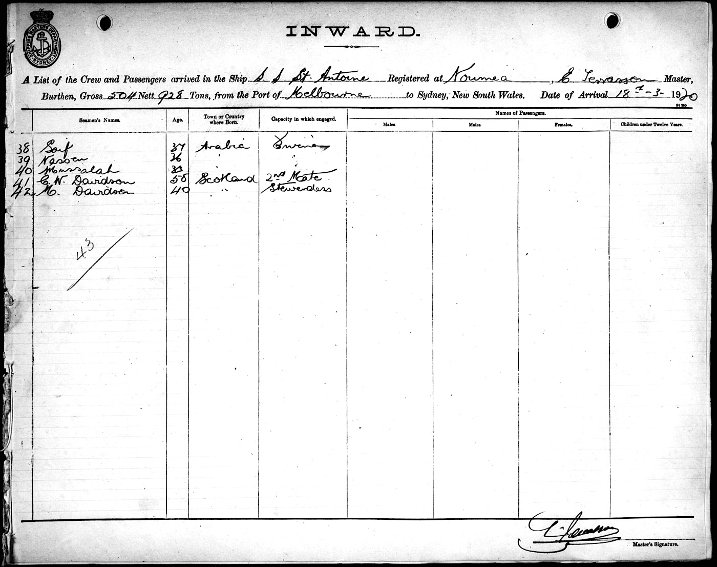 SAINT ANTOINEOF NOUMEA, E. TERRASSON, MASTER, BURTHEN 504/928 TONS FROM THE PORT OF MELBOURNE TO SYDNEY, NEW SOUTH WALES, 18TH MARCH 1920 |
