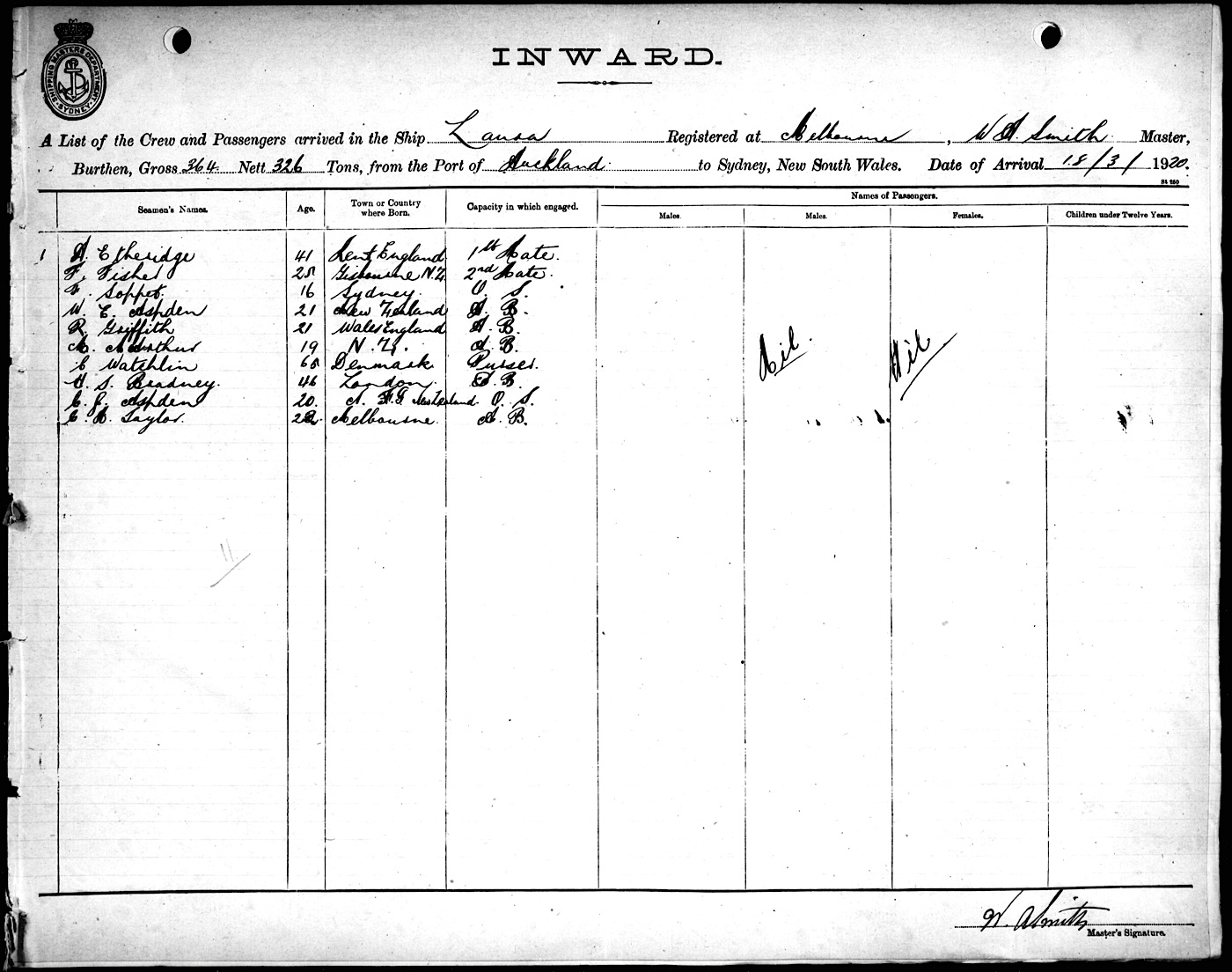 LAURAOF MELBOURNE, W. A. SMITH, MASTER, BURTHEN 364/326 TONS FROM THE PORT OF AUCKLAND TO SYDNEY, NEW SOUTH WALES, 18TH MARCH 1920 |