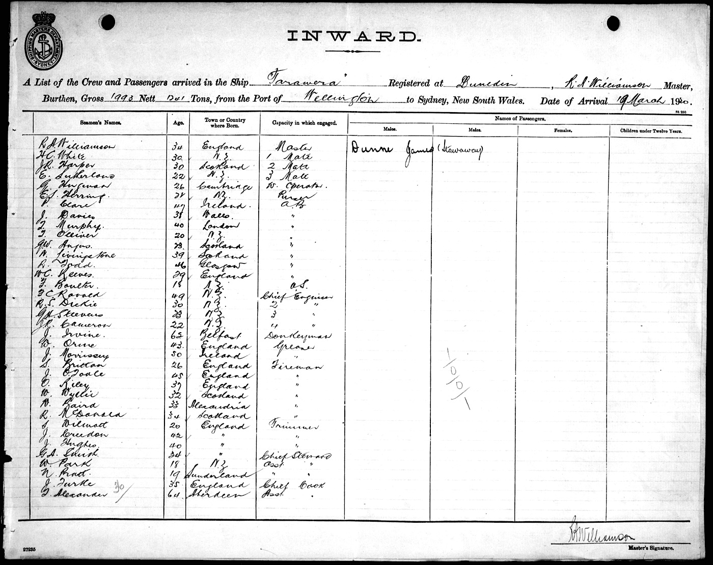 TARAWERAOF DUNEDIN, R. A. WILLIAMSON, MASTER, BURTHEN 1993/1241 TONS FROM THE PORT OF WELLINGTON TO SYDNEY, NEW SOUTH WALES, 19TH MARCH 1920 |