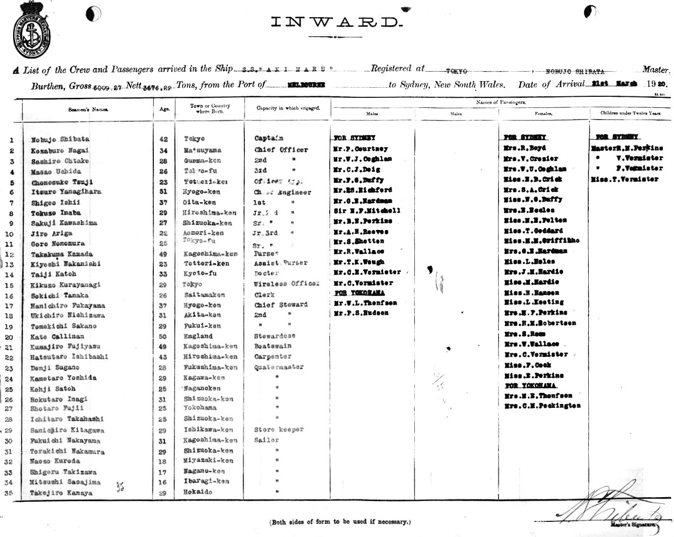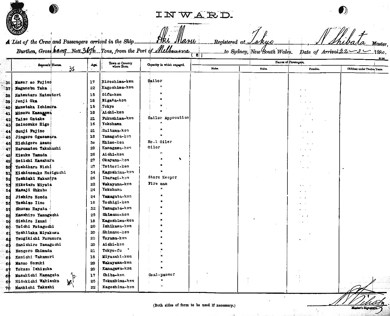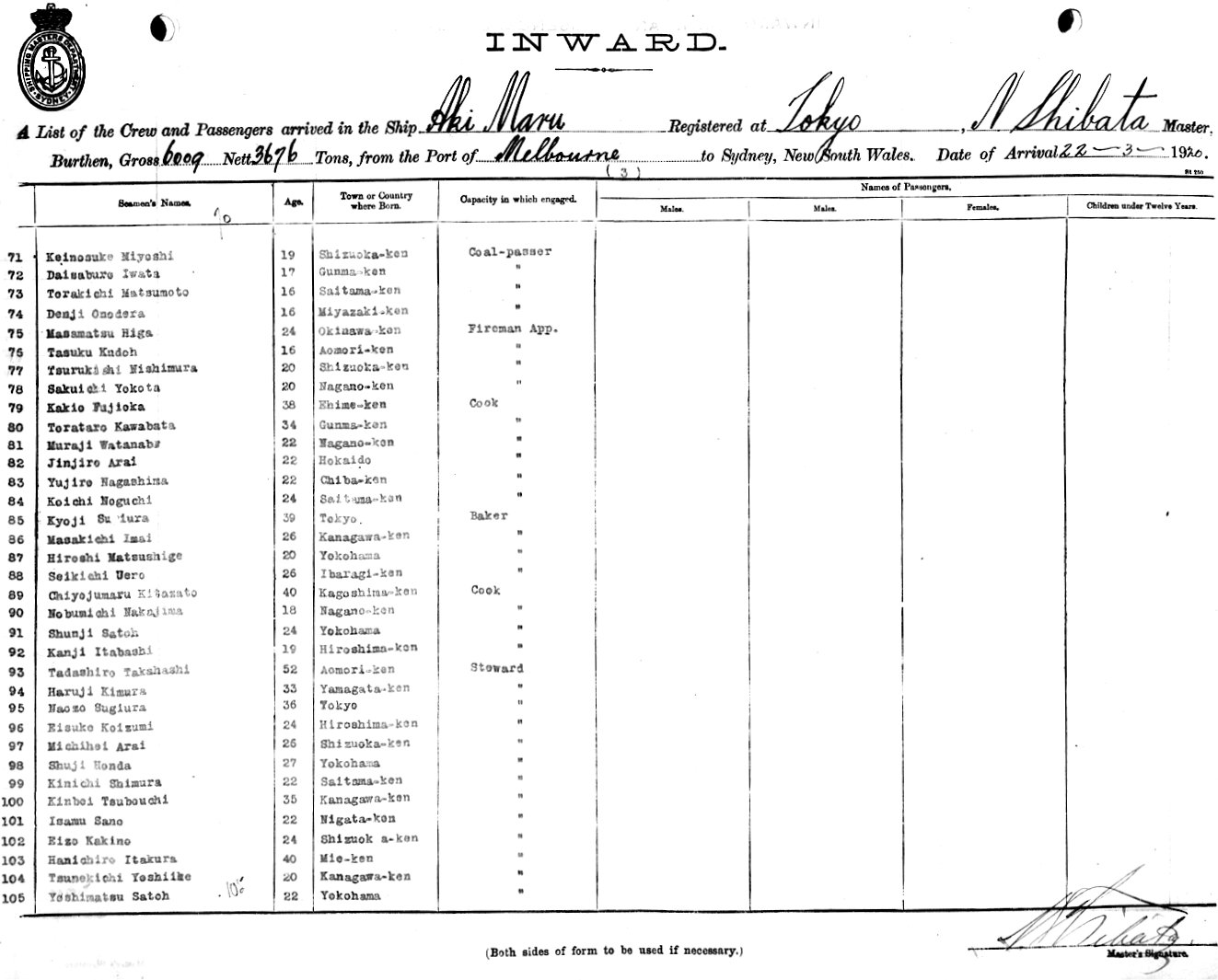 AKI MARUOF TOKYO, NOBUJO SHBATA MASTER, BURTHEN GROSS 6009. 27 NETT 3676. 22 TONS FROM THE PORT OF MELBOURNE TO SYDNEY, NEW SOUTH WALES, 21ST MARCH 1920 |