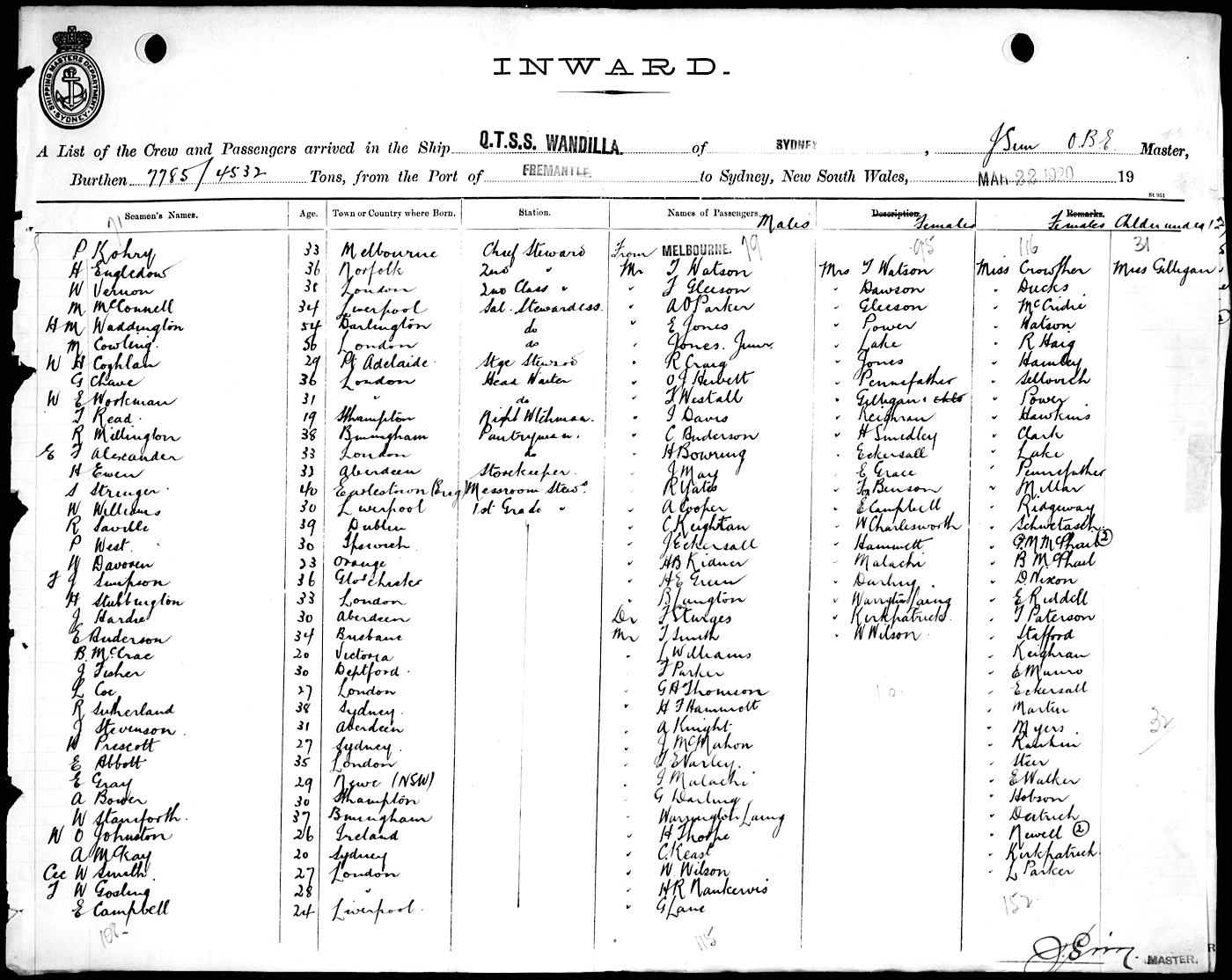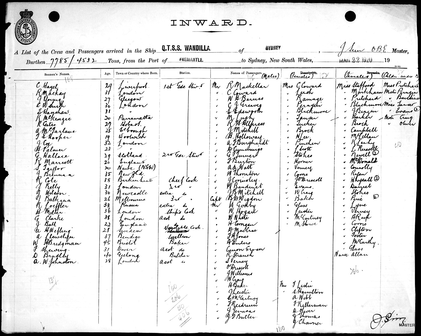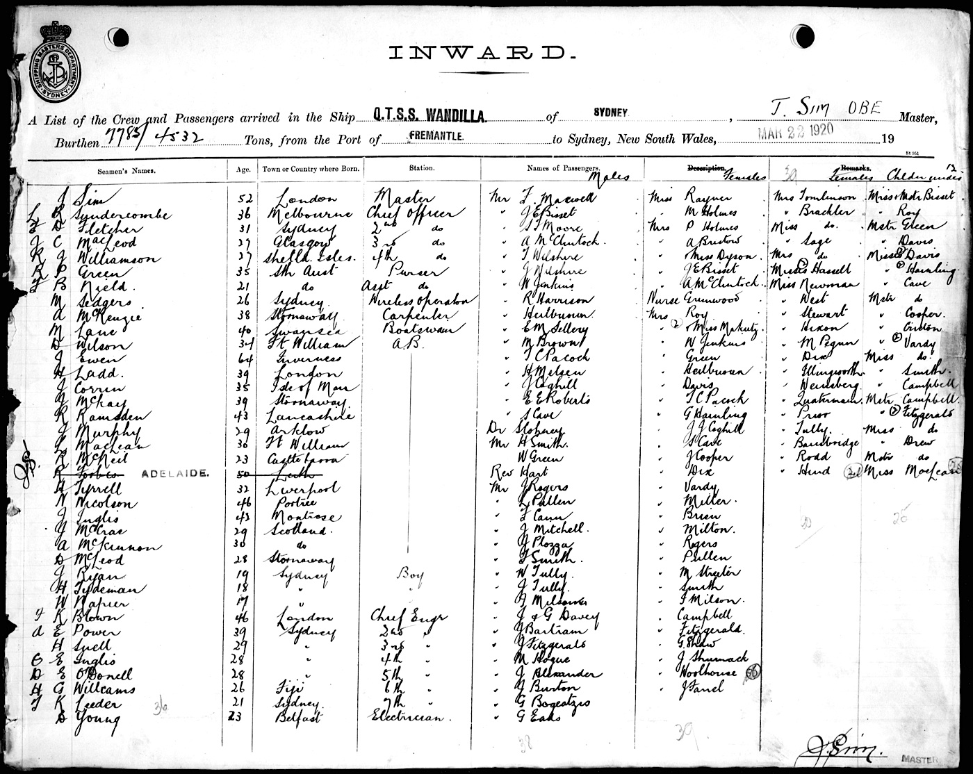 Mariners and ships in Australian Waters | WANDILLAOF SYDNEY, J. SIM, O.B.E., MASTER, BURTHEN 7785/4532 TONS FROM THE PORT OF FREMANTLE TO SYDNEY, NEW SOUTH WALES, 22ND MARCH 1920 |