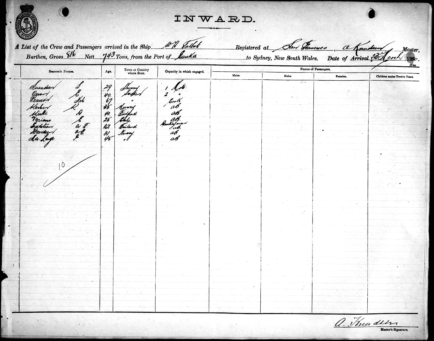 W H TALBOTOF SAN FRANCISCO, A. KNUDSEN, MASTER, BURTHEN 816/743 TONS FROM THE PORT OF EUREKA, U.S.A. TO SYDNEY, NEW SOUTH WALES, 23RD MARCH 1920 |