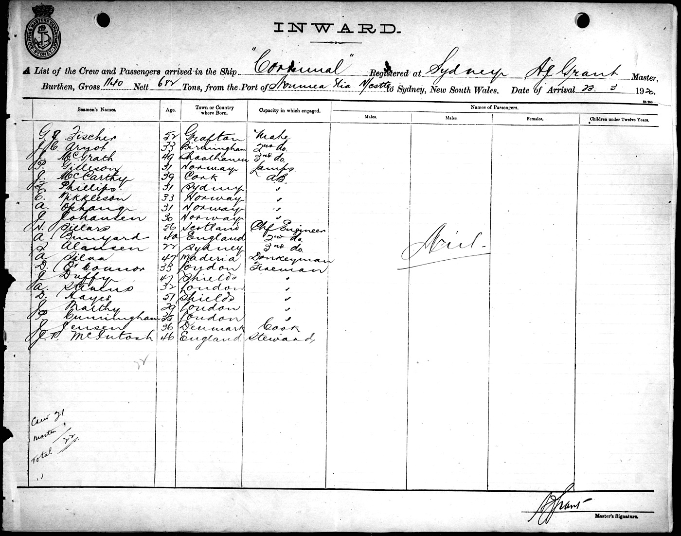 CORRIMALOF SYDNEY, A. J. GRANT, MASTER, BURTHEN 1140/682 TONS FROM THE PORT OF NOUMEA VIA NEWCASTLE TO SYDNEY, NEW SOUTH WALES, 23RD MARCH 1920 |