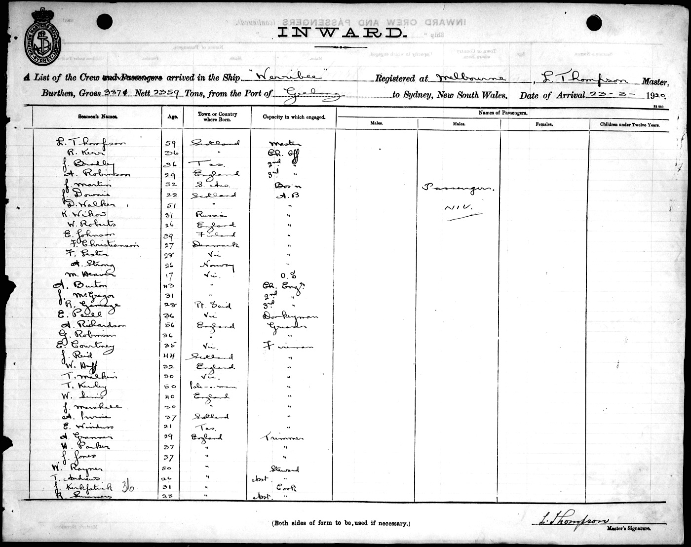 WERRIBEEOF MELBOURNE, L. THOMPSON, MASTER, BURTHEN 3871/2359 TONS FROM THE PORT OF GEELONG TO SYDNEY, NEW SOUTH WALES, 23RD MARCH 1920 |