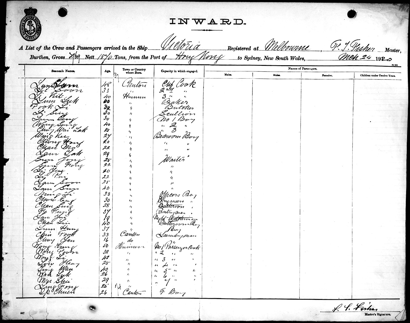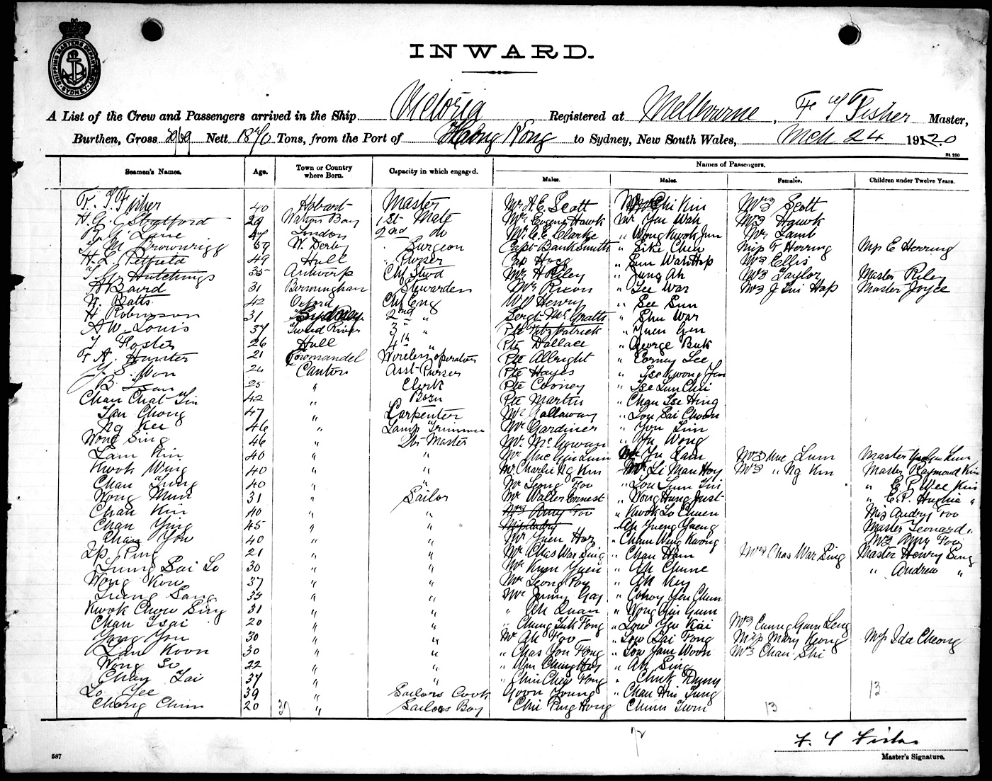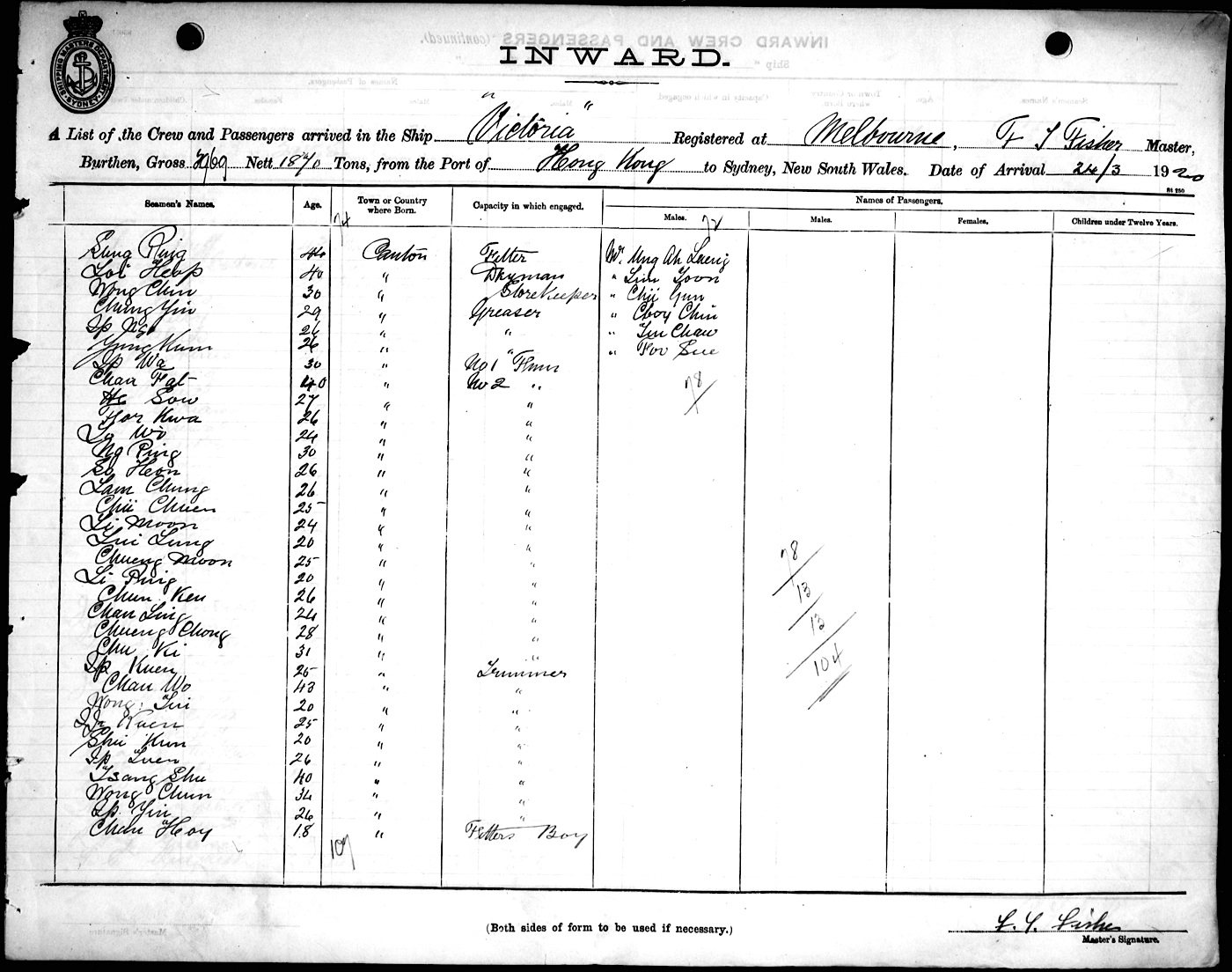VICTORIAOF MELBOURNE, F. T. FISHER, MASTER, BURTHEN 2969/1870 TONS FROM THE PORT OF HONG KONG TO SYDNEY, NEW SOUTH WALES, 24TH MARCH 1920 |
