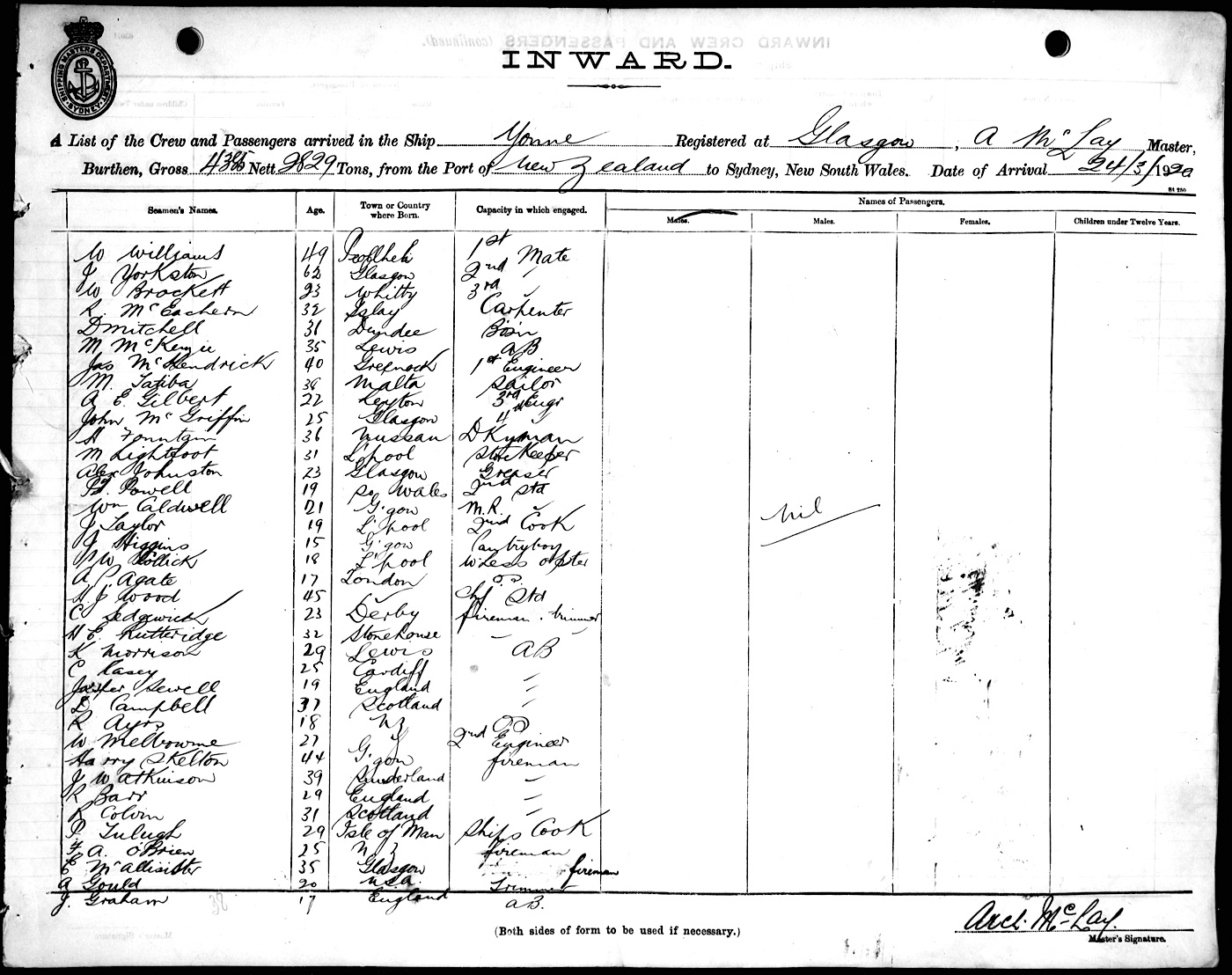 YONNEOF GLASGOW, A. MCLAY, MASTER, BURTHEN 4385/2829 TONS FROM THE PORT OF NEW ZEALAND TO SYDNEY, NEW SOUTH WALES, 24TH MARCH 1920 |