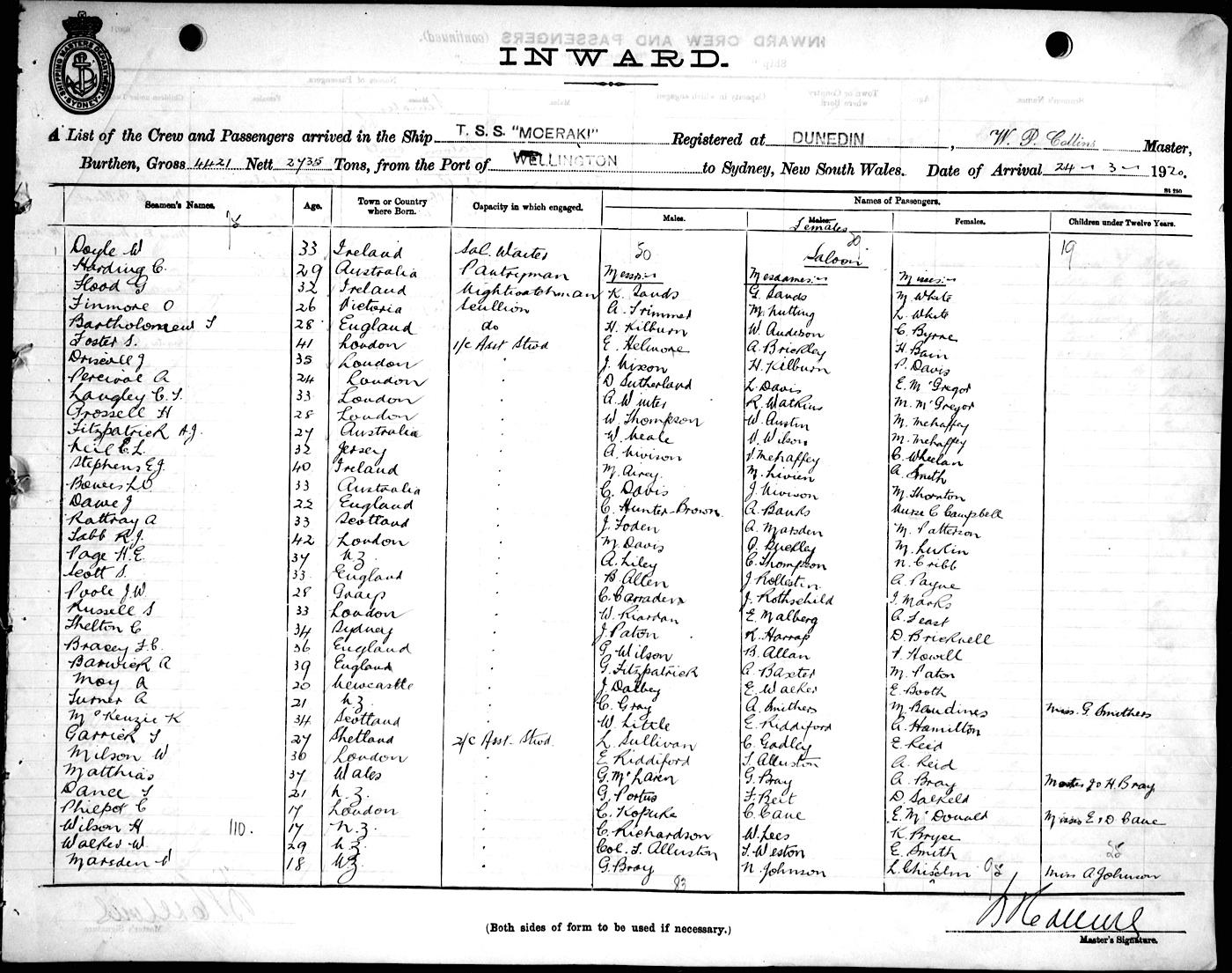 MOERAKIOF DUNEDIN, W. P. COLLINS, MASTER, BURTHEN 4421/2735 TONS FROM THE PORT OF WELLINGTON TO SYDNEY, NEW SOUTH WALES, 24TH MARCH 1920 |