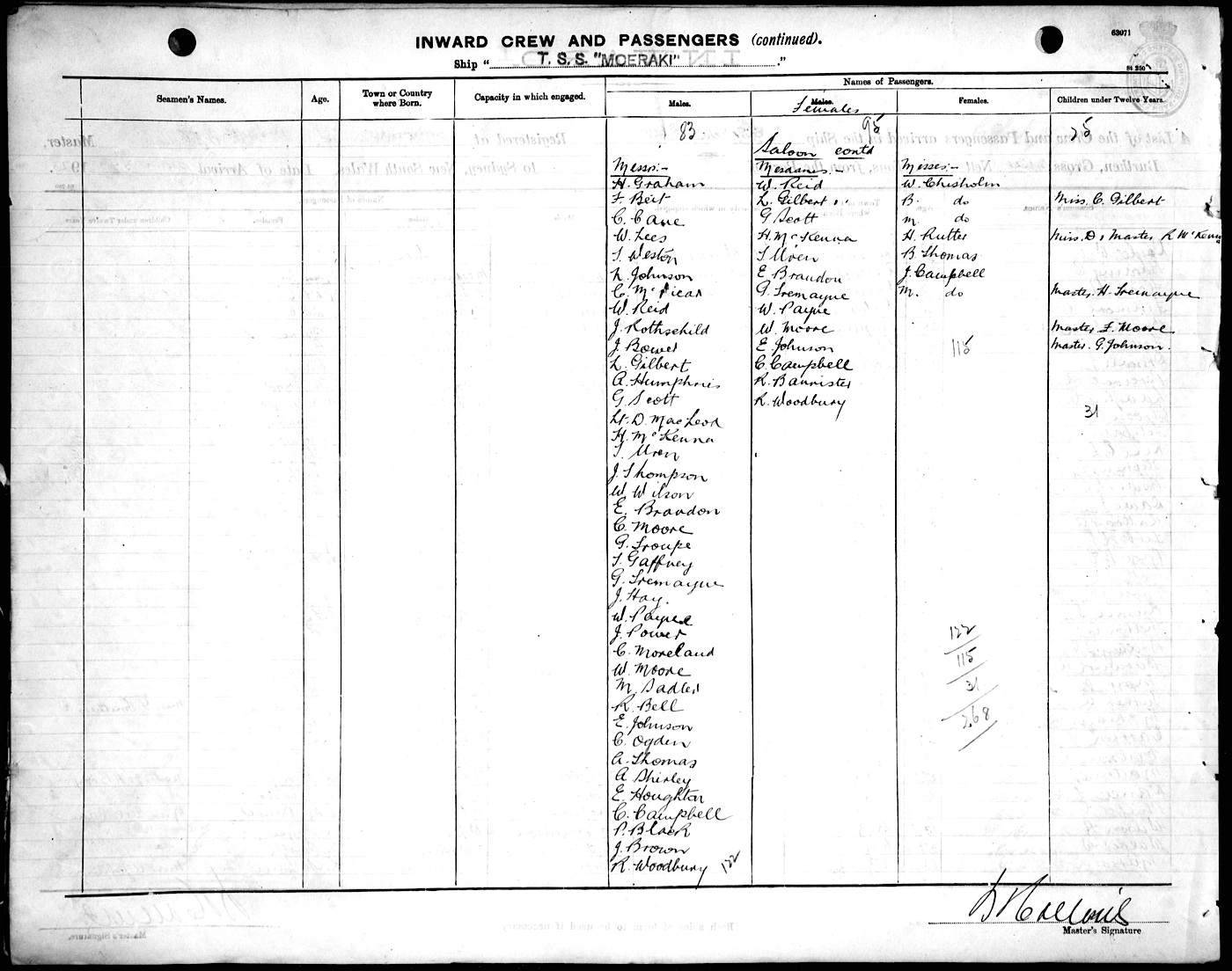 Source: State Records Authority of New South Wales: Shipping Master's Office; Passengers Arriving 1855 - 1922; NRS13278, [X443] reels 2109 & 2110. Transcribed by Lester Hamilton. Proofread by Lyn & Maurie. You may view/print a scan of the original list - a monitor set to high resolution is recommended for clarity. Use your back button to return. |