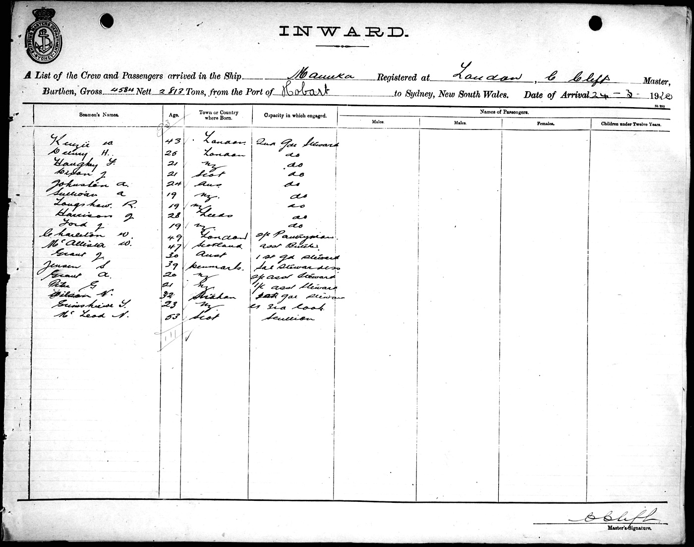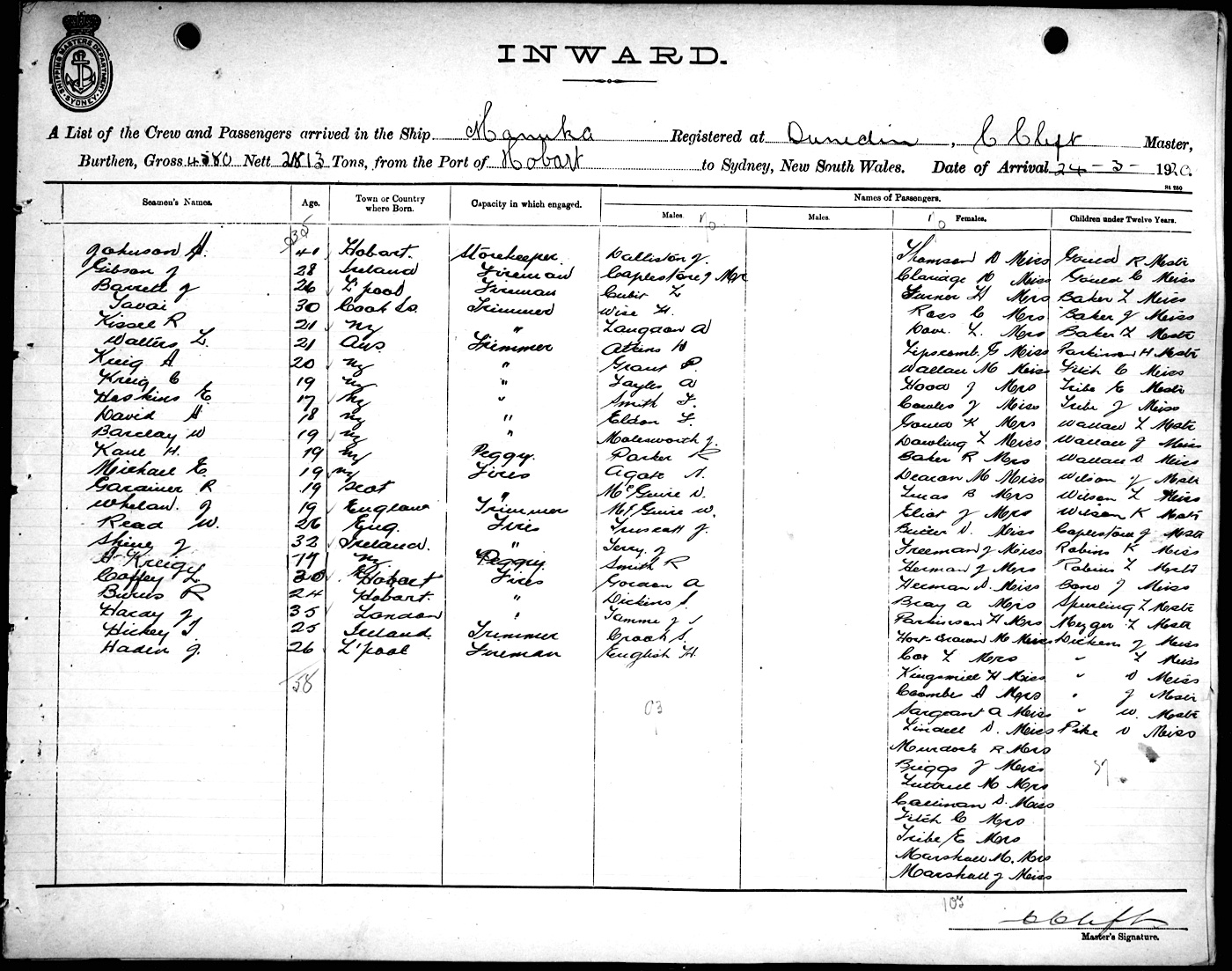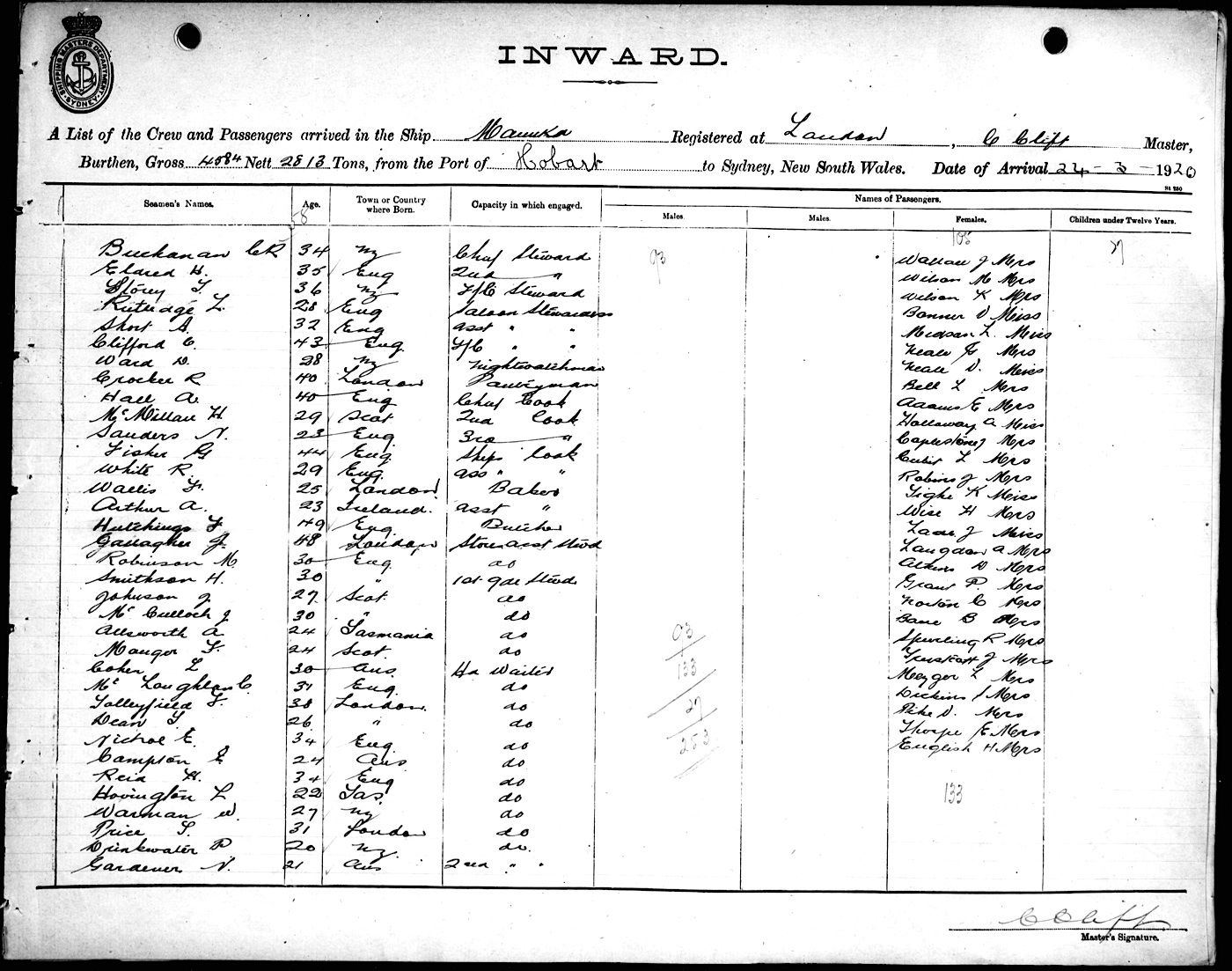 MANUKAOF LONDON, C. CLIFT, MASTER, BURTHEN 4580/2813 TONS FROM THE PORT OF HOBART TO SYDNEY, NEW SOUTH WALES, 23RD MARCH 1920 |