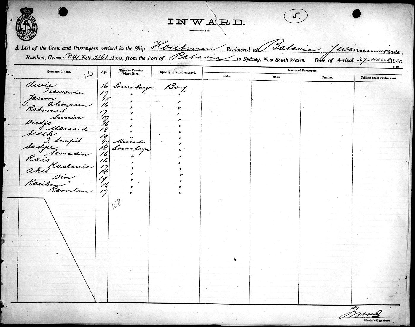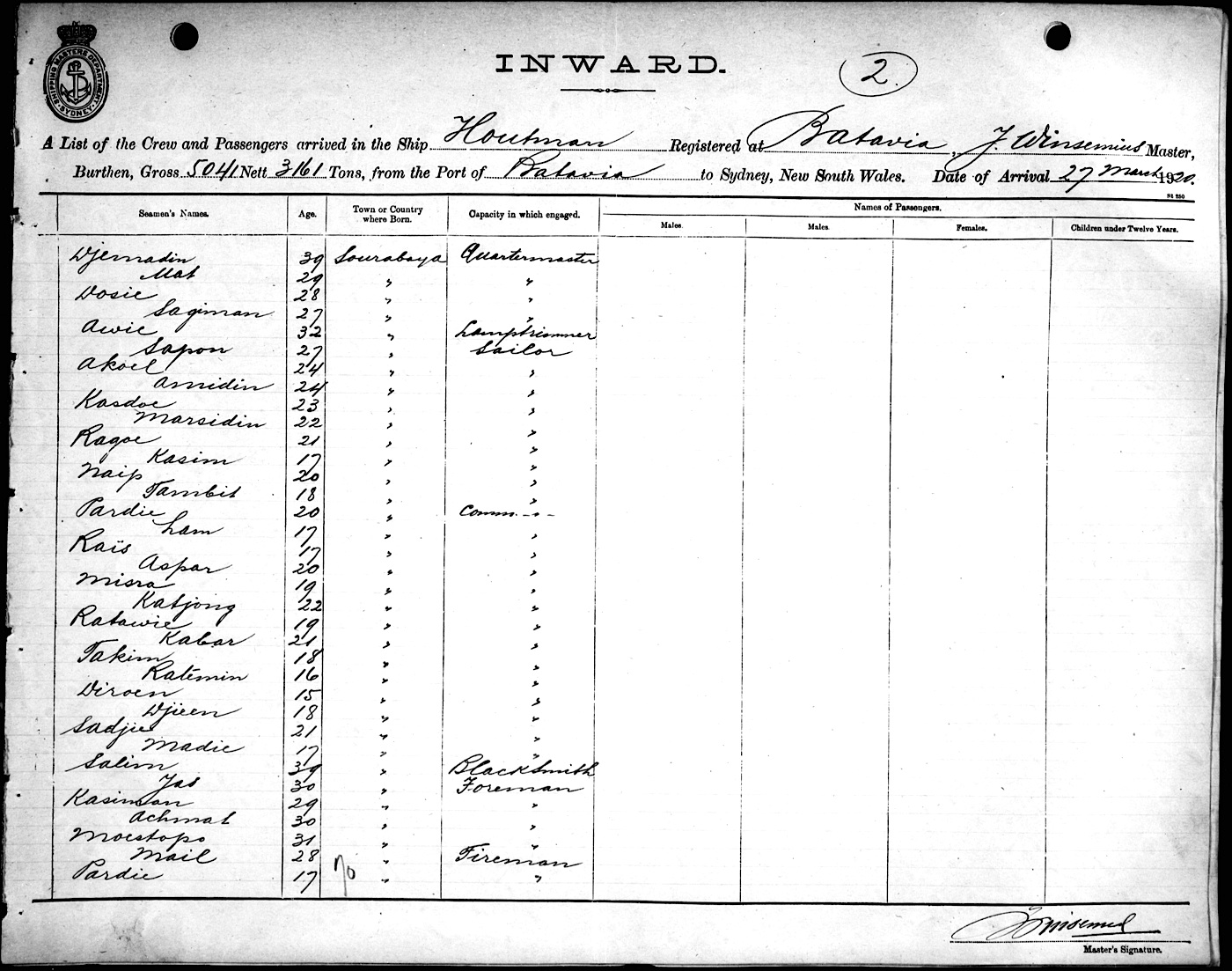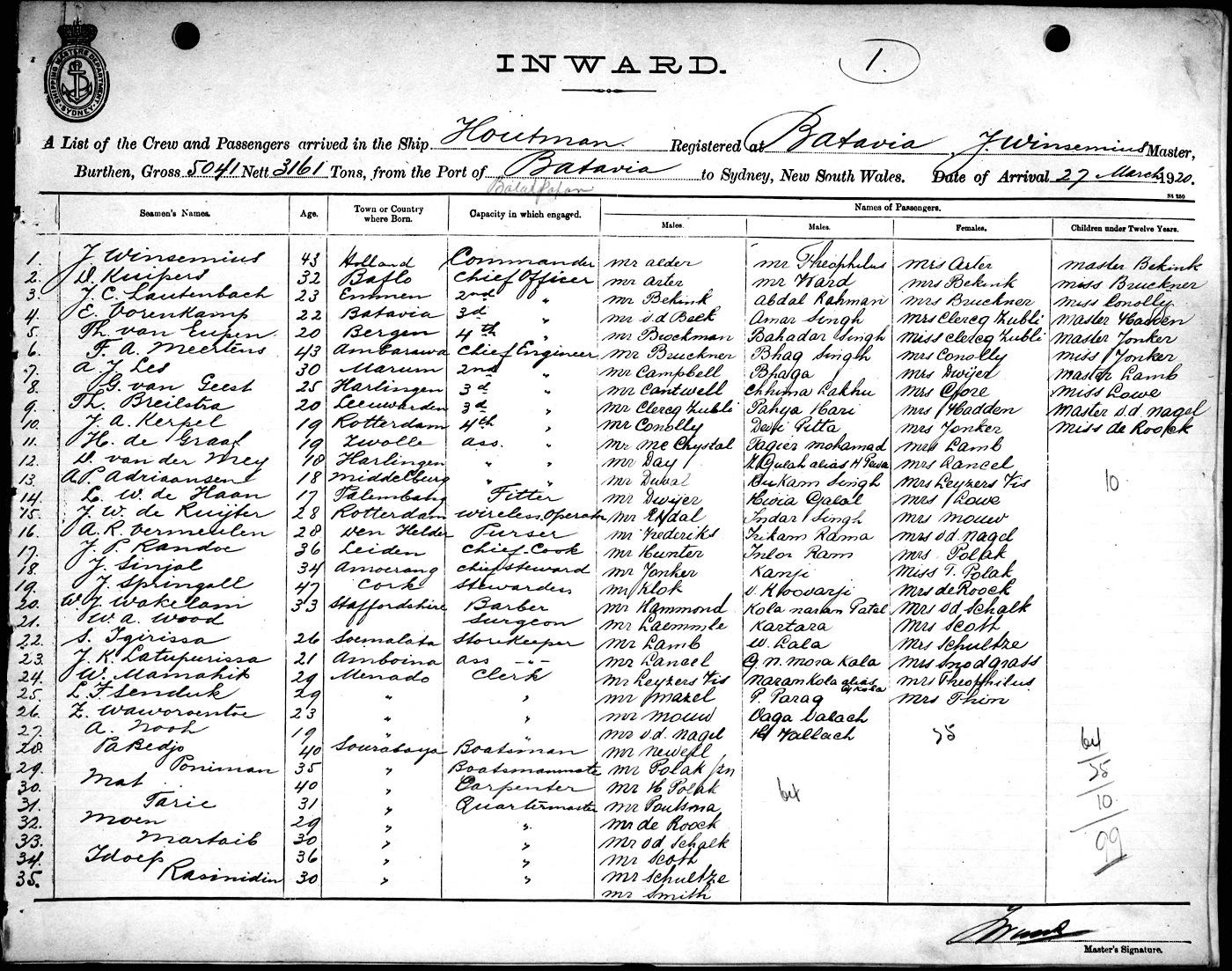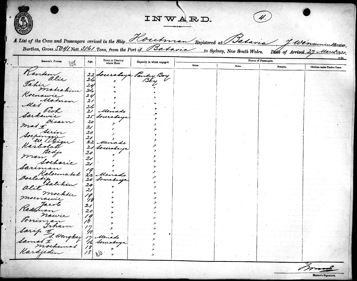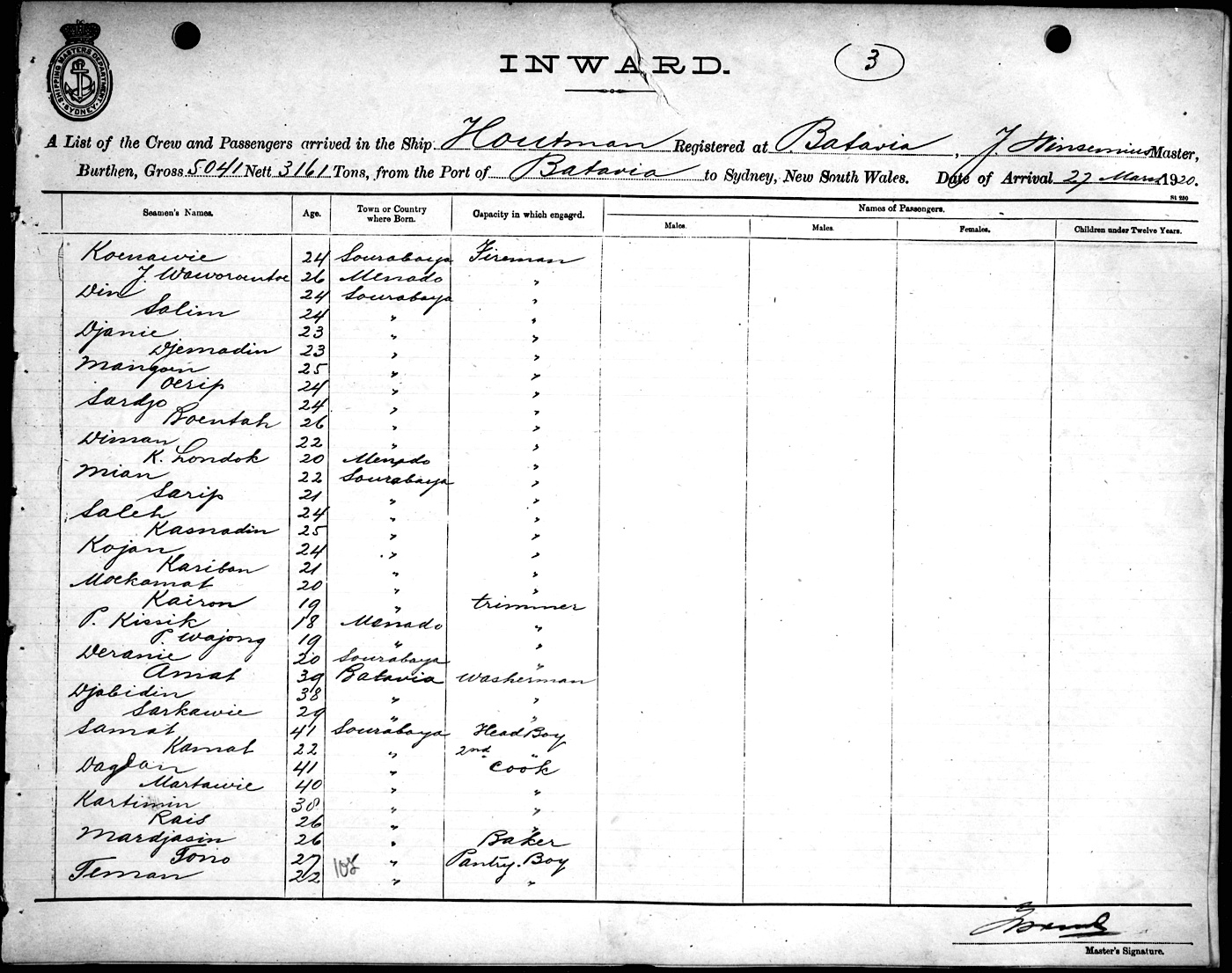 HOUTMANOF BATAVIA, J. WINSEMIUS, MASTER, BURTHEN 5041/3161 TONS FROM THE PORT OF BATAVIA via BALAKPAPAN & PORTS TO SYDNEY, NEW SOUTH WALES, 27TH MARCH 1920 |