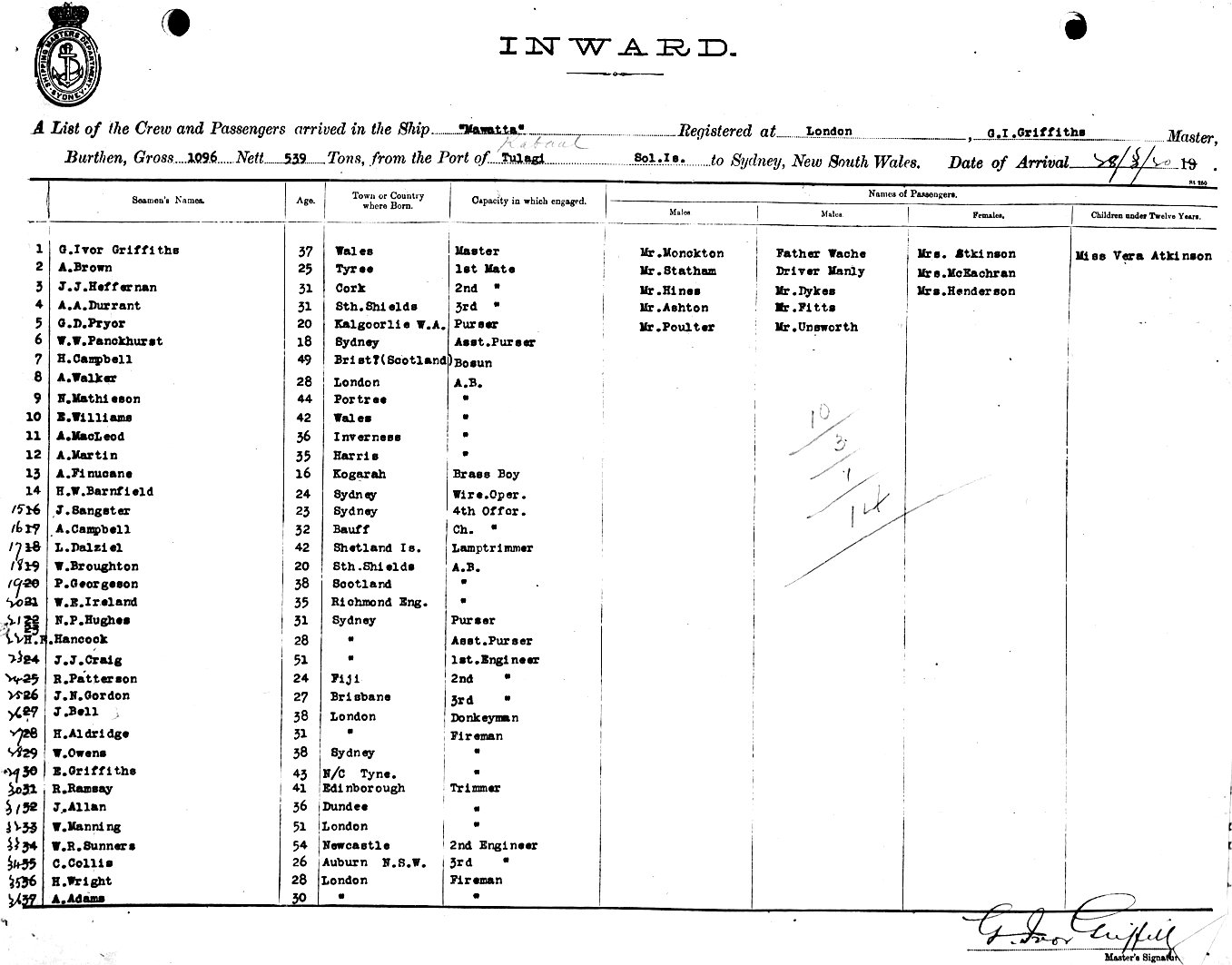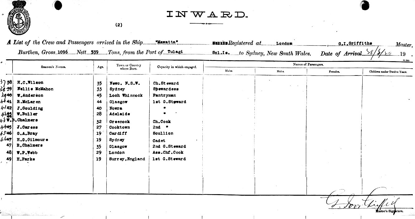 Mariners and ships in Australian Waters | MAWATTAOF LONDON, G. I. GRIFFITHS, MASTER, BURTHEN GROSS 1096 NETT 539 TONS FROM THE PORT OF TULAGI, SOLOMON ISLANDS TO SYDNEY, NEW SOUTH WALES, 28TH MARCH 1920 |