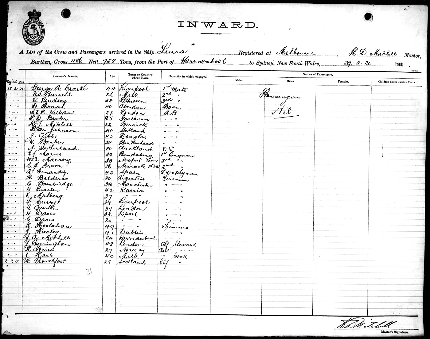 Mariners and ships in Australian Waters | LEURAOF MELBOURNE, H. D. MITCHELL, MASTER, BURTHEN 1186/758 TONS FROM THE PORT OF WARRNAMBOOL TO SYDNEY, NEW SOUTH WALES, 29TH MARCH 1920 |