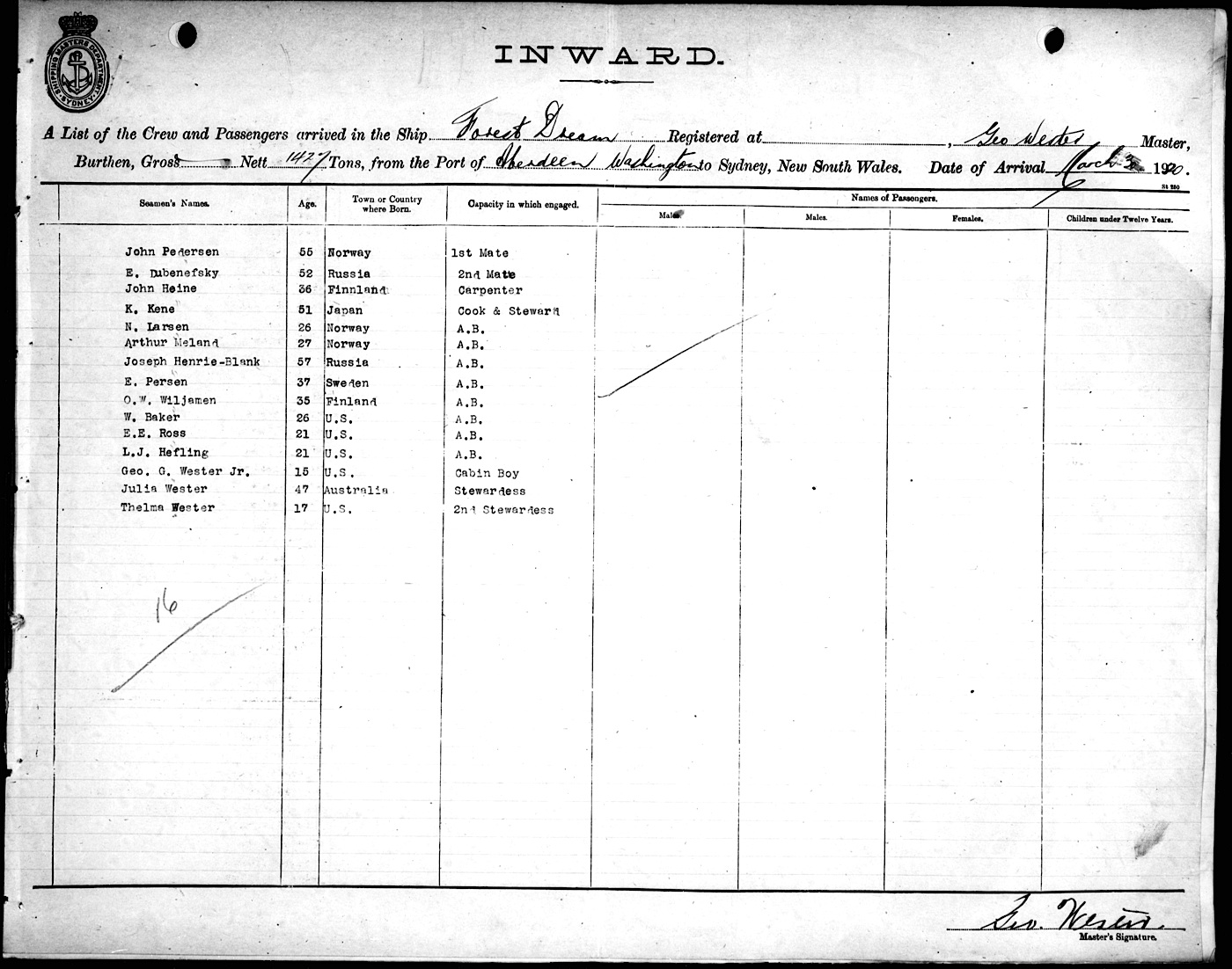 FOREST DREAMOF U.S.A., GEO. WESTER, MASTER, BURTHEN 1427 TONS FROM THE PORT OF ABERDEEN, WASHINGTON TO SYDNEY, NEW SOUTH WALES, 30TH MARCH 1920 |