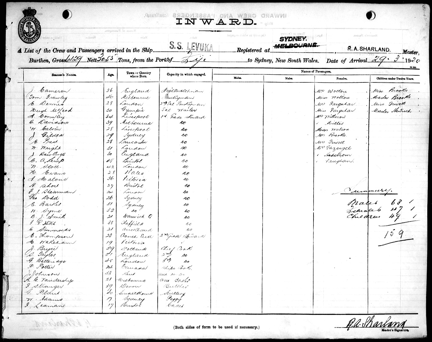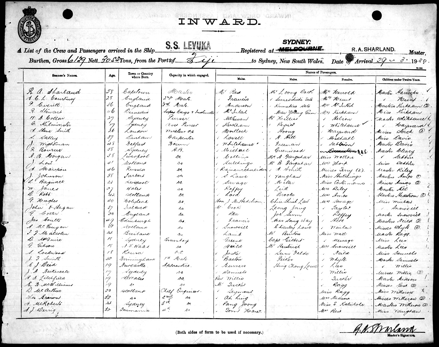LEVUKAOF SYDNEY, R. A. SHARLAND, MASTER, BURTHEN 6129/3055 TONS FROM THE PORT OF FIJI TO SYDNEY, NEW SOUTH WALES, 29TH MARCH 1920 |