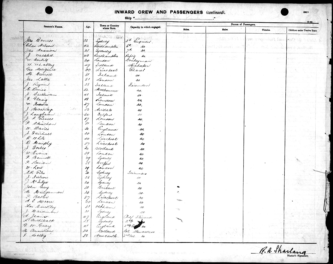 Source: State Records Authority of New South Wales: Shipping Master's Office; Passengers Arriving 1855 - 1922; NRS13278, [X443] reels 2109 & 2110. Transcribed by Lester Hamilton. Proofread by Lyn & Maurie. You may view/print a scan of the original list - a monitor set to high resolution is recommended for clarity. Use your back button to return. |