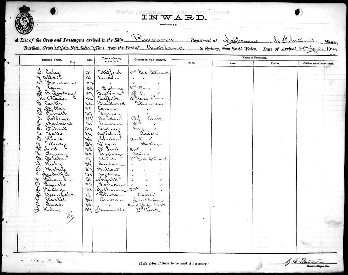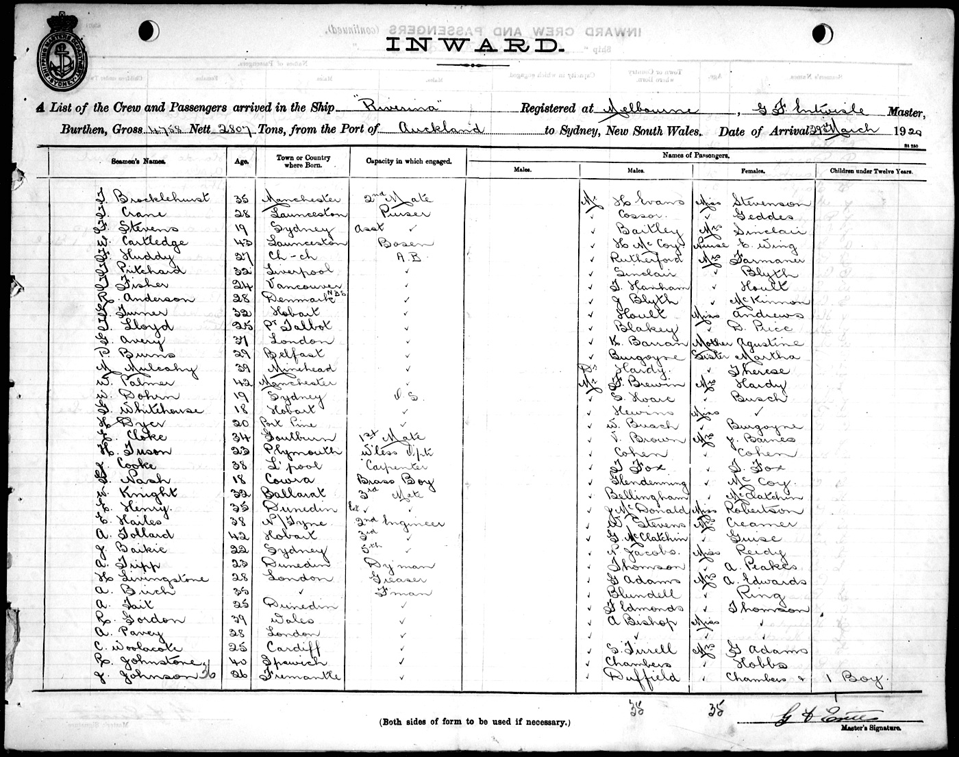 RIVERINAOF MELBOURNE, G. F. ENTWISLE, MASTER, BURTHEN 4758/2807 TONS FROM THE PORT OF AUCKLAND TO SYDNEY, NEW SOUTH WALES, 29TH MARCH 1920 |