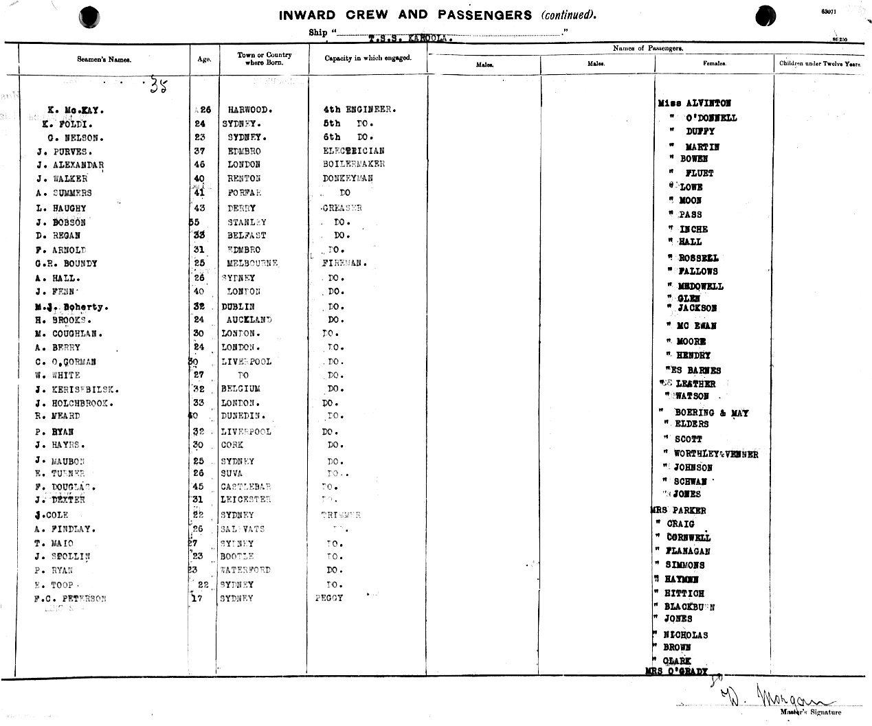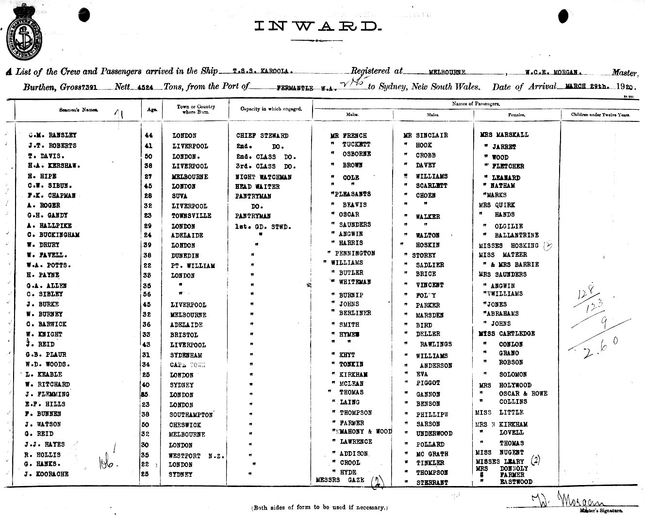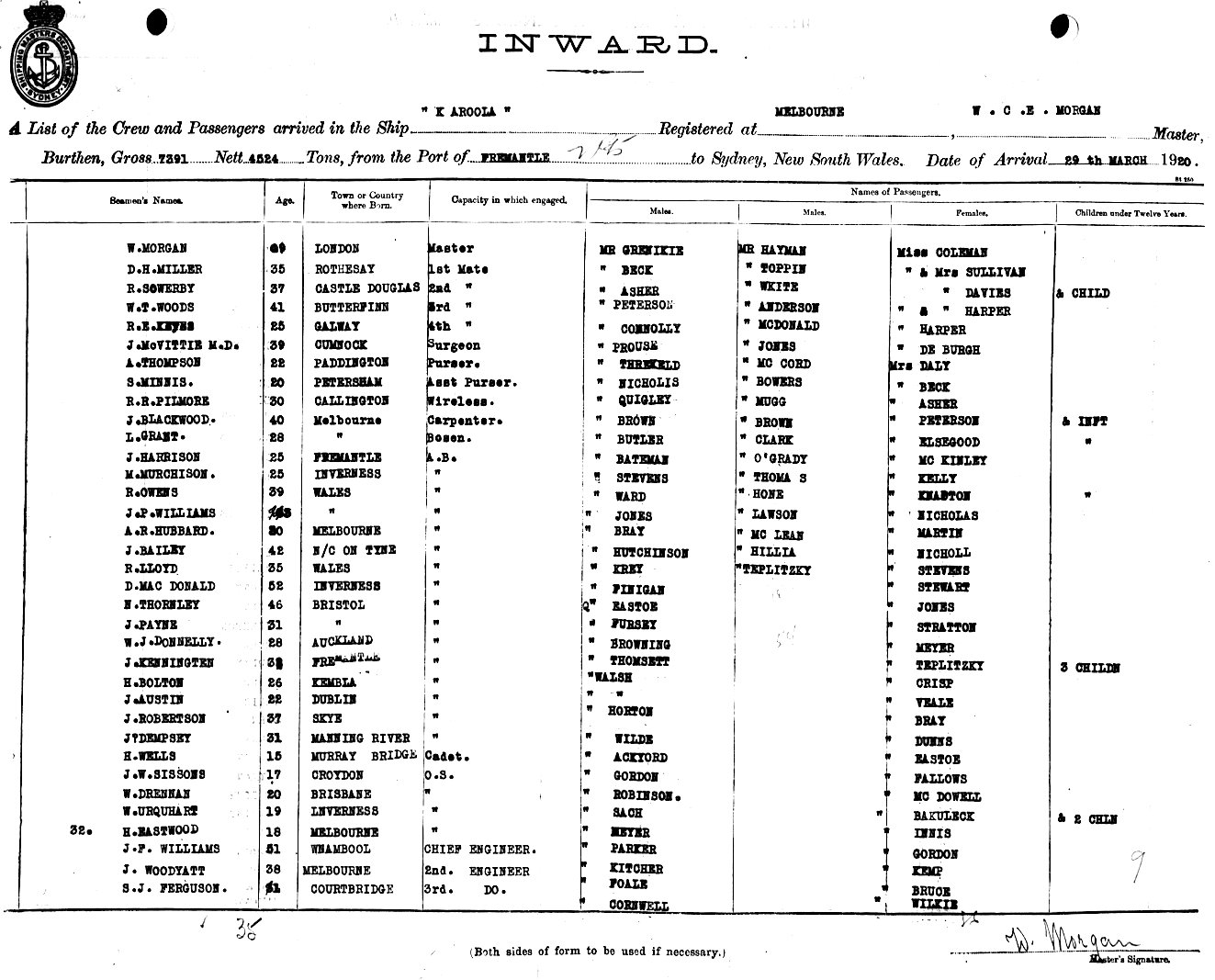 Mariners and ships in Australian Waters | KAROOLAOF MELBOURNE, W. MORGAN, MASTER, BURTHEN GROSS 7391 NETT 4524 TONS FROM THE PORT OF FREMANTLE & PORTS TO SYDNEY, NEW SOUTH WALES, 29TH MARCH 1920 |